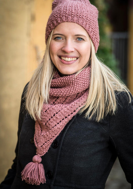Hue og halsedisse med perlemønster og kvast opskrift