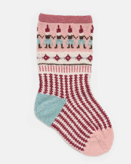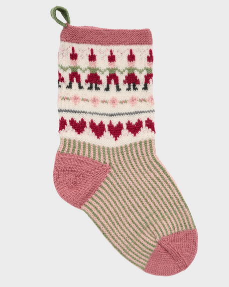 LF03 - Strikket julesok med nisseranke og rosa-grøn stribe
