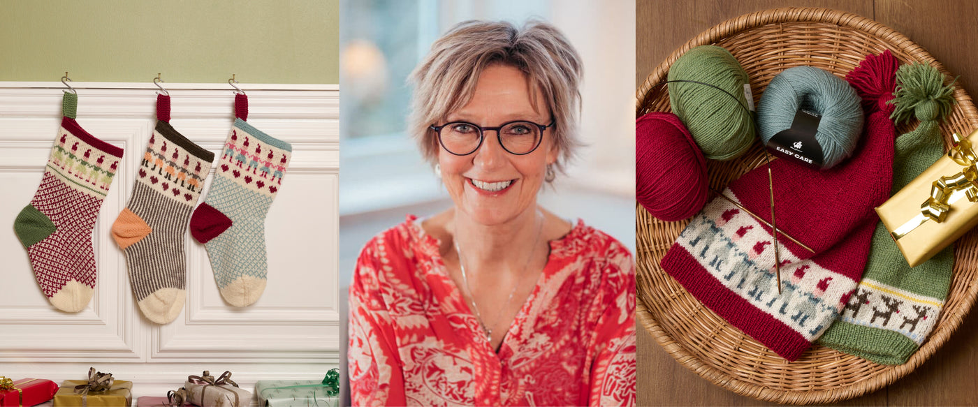 LF07 - Strikket julesok med små nisser og turkis rudemønster