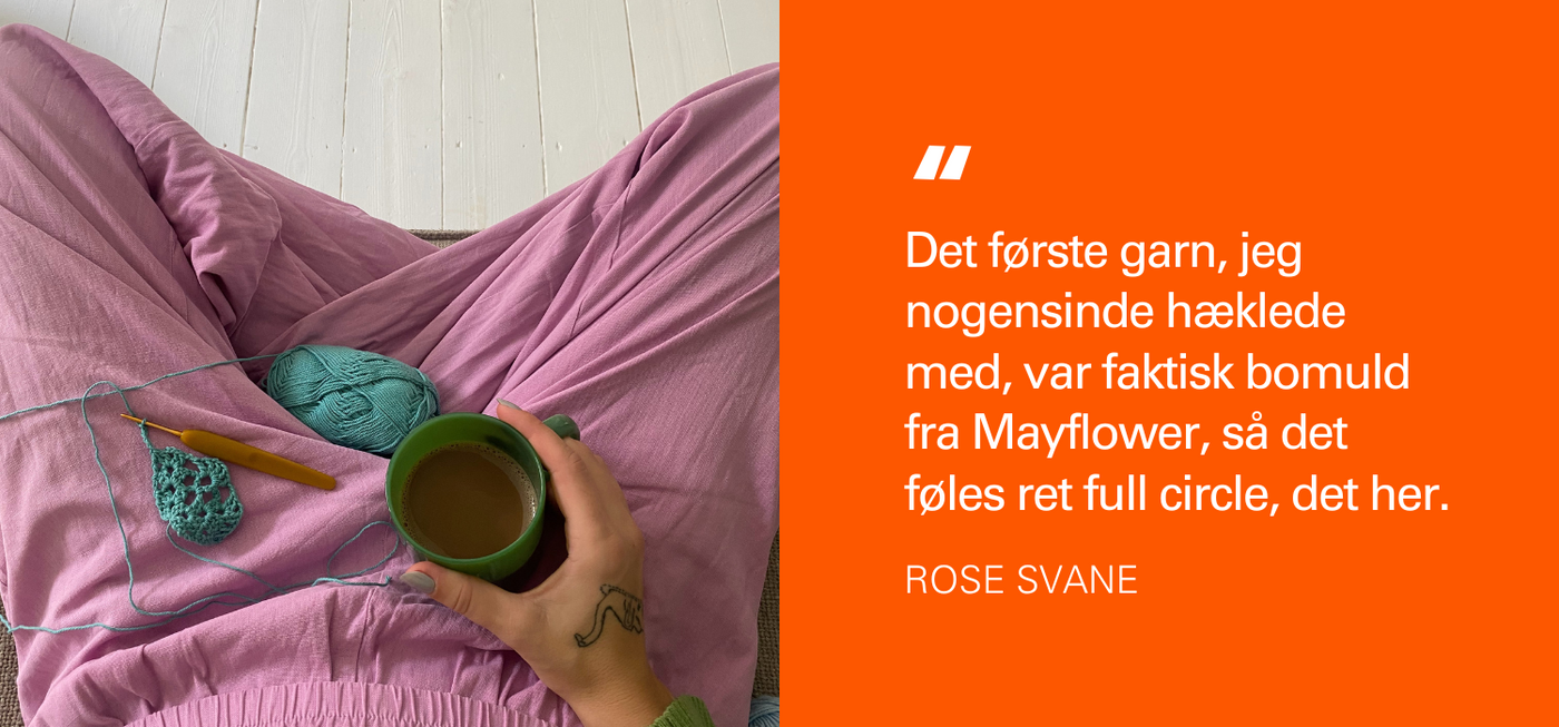 Rose har altid hæklet med bomuldsgarn fra Mayflower, så hun har selvfølgelig fået mulighed for at udvælge hendes yndlingsfarver i Cotton 8/8. Se de nøje udvalgte farver her og køb garnet til dit næste hækleprojekt.