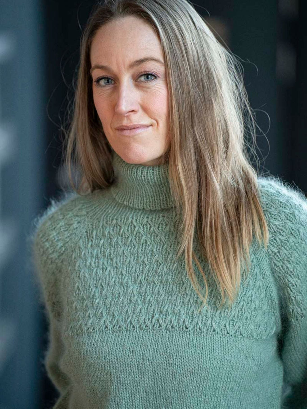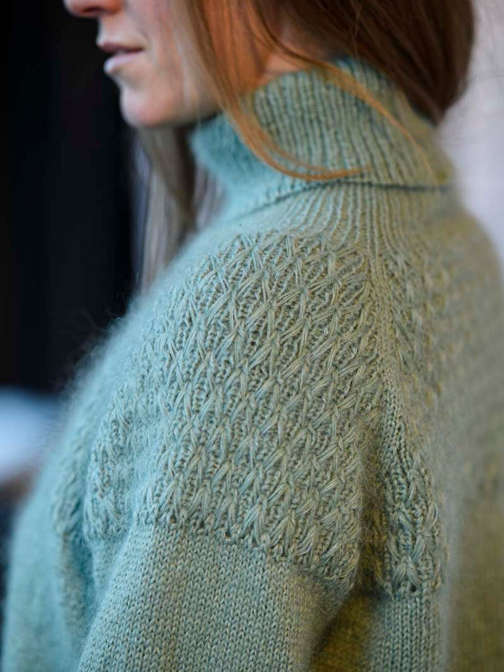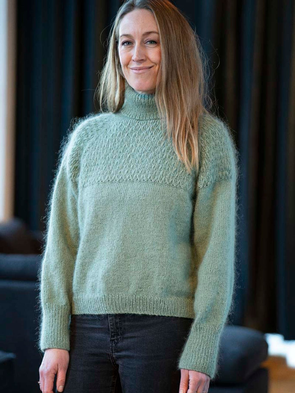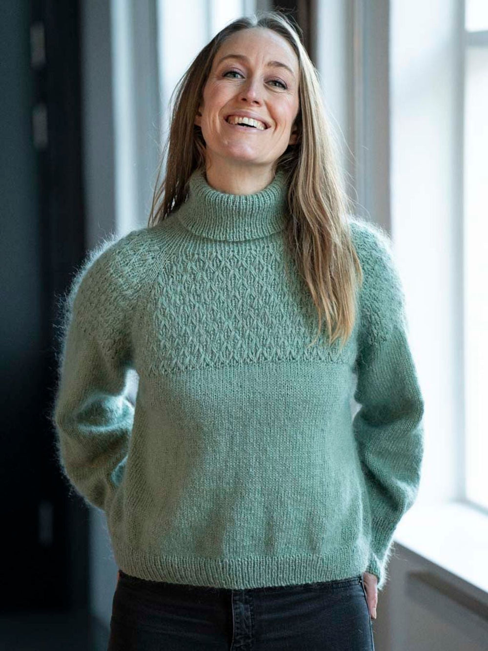 Top-down sweater, som strikkes med raglanudtagninger, rullekrave og et yndigt strukturmønster i bærestykket. Sweaterens klassiske opbygning peppes op af det fine mønster i bærestykket og ikke mindst garnkombinationen.