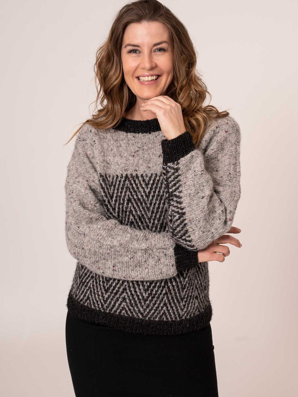 Noget af det første, der springer i øjnene, er det to-farvede strukturmønster fra brystet og ned, som er lavet i vævestrik. Vævestrik strikkes i glatstrik efter diagram og giver blusen en fantastisk effekt.