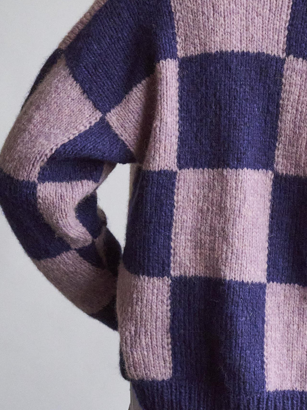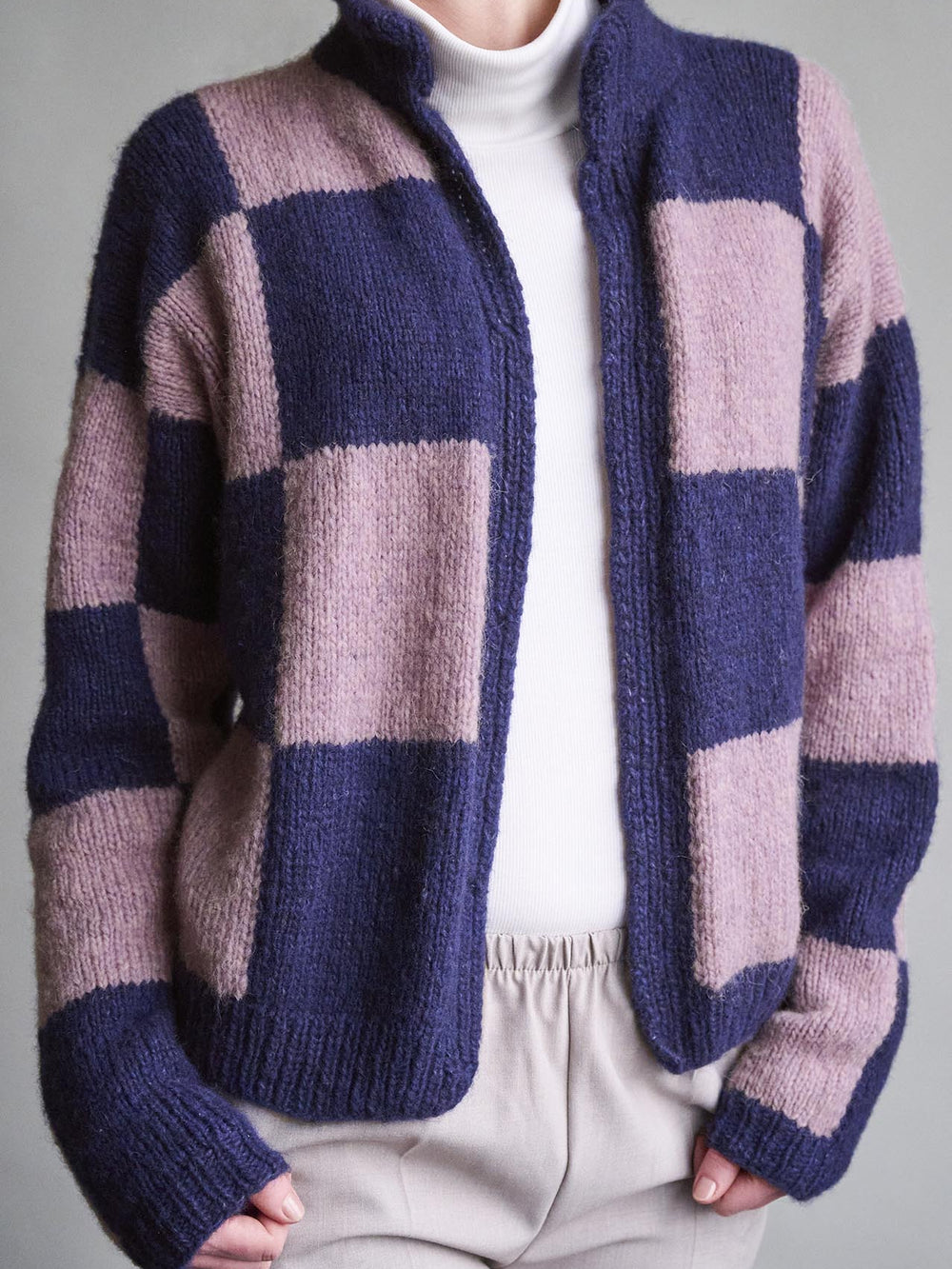 Agnes cardigan har et fedt design med store tern, knapper og en høj krave. Cardiganen er strikket i en lækker og lun kvalitet, som også gør designet egnet som jakke i overgangsperioden.