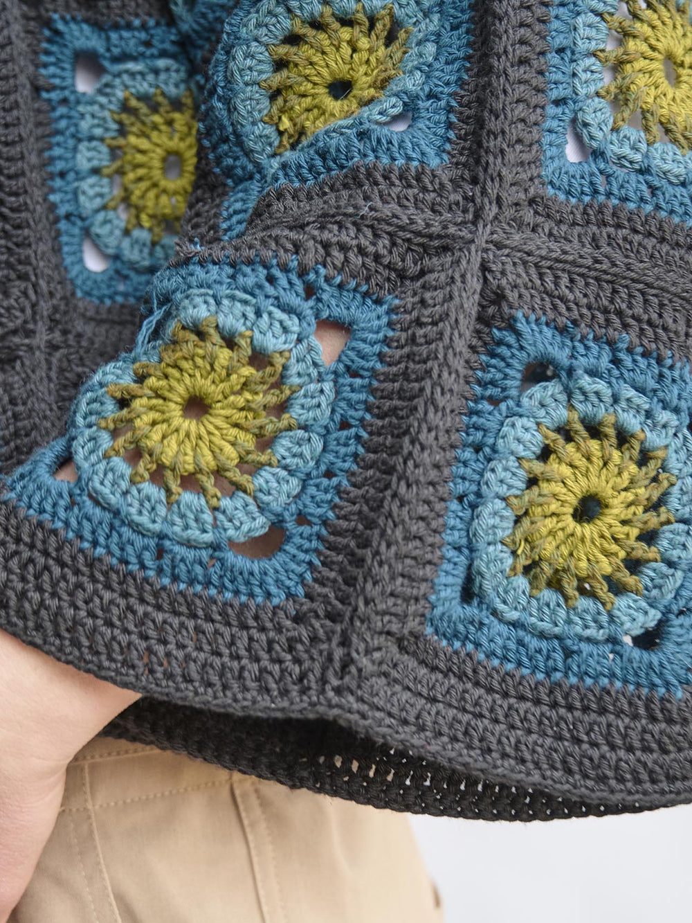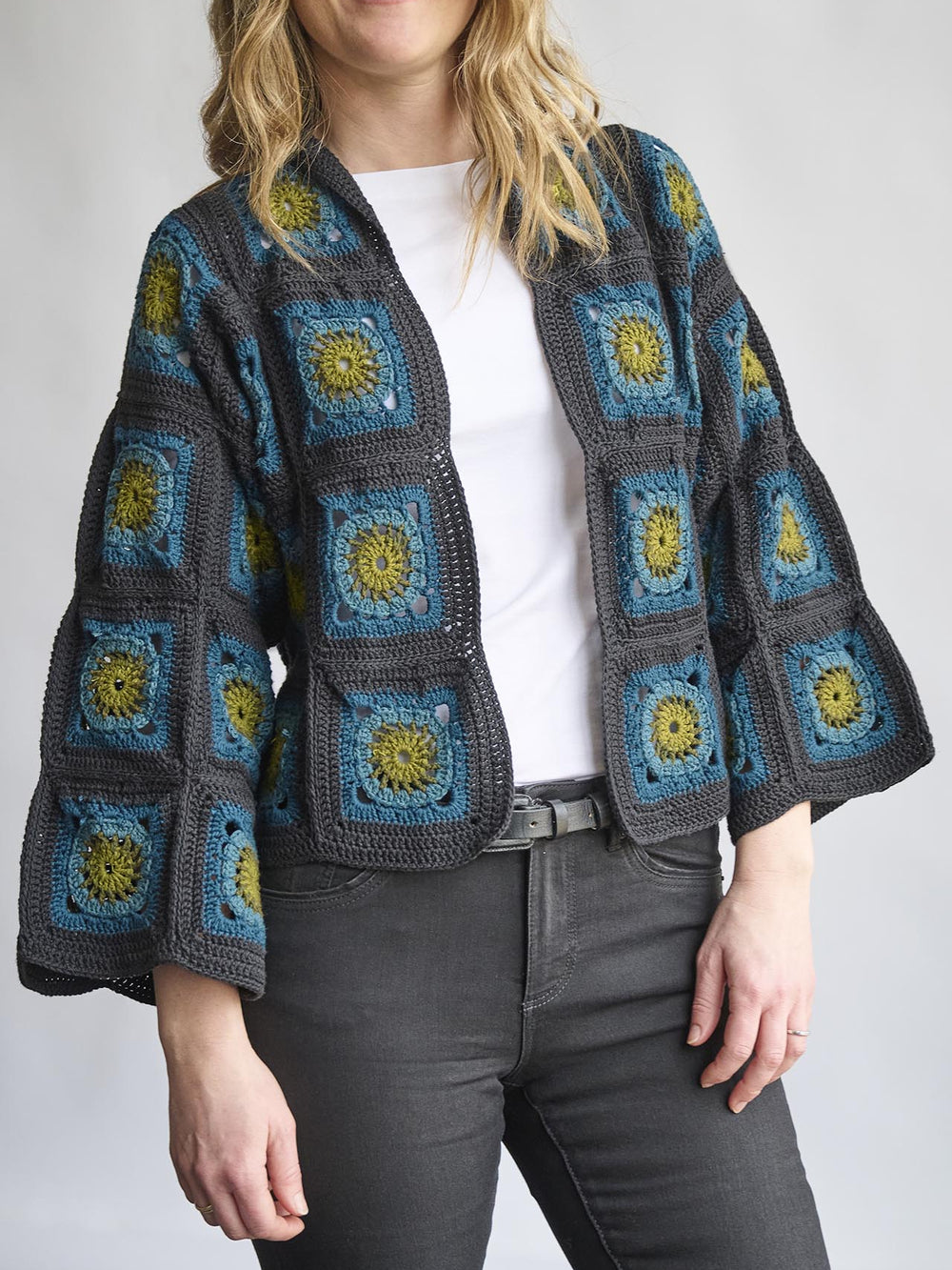 Cool design i en kort model, som kan bruges både som cardigan og jakke. Cardiganen hæklet i oldemorfirkanter, der laves hver for sig og giver et nemt og overskueligt projekt, fordi der kun skal fokuseres på én firkant ad gangen. Der skal hækles 56 firkanter i alt, som sys sammen til sidst og afsluttes med hæklede kantmasker hele vejen rundt.