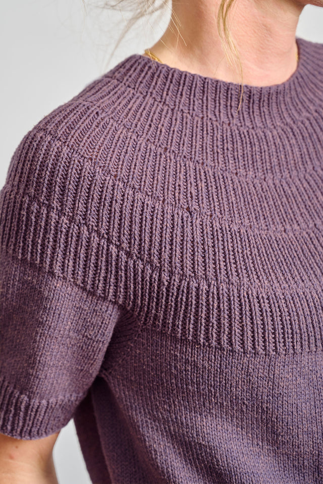 Anker tee fra PetiteKnit er strikket oppefra og ned med ribstruktur i bærestykket og glatstrik på kroppen.
