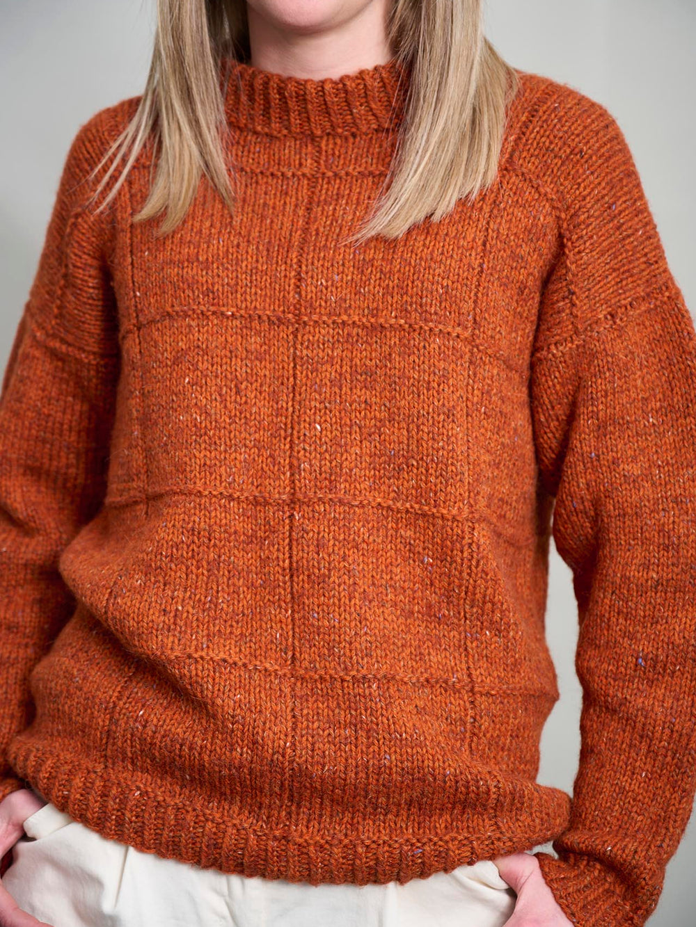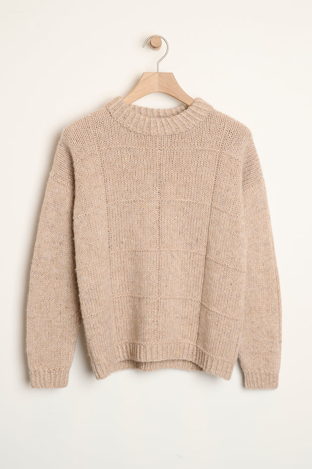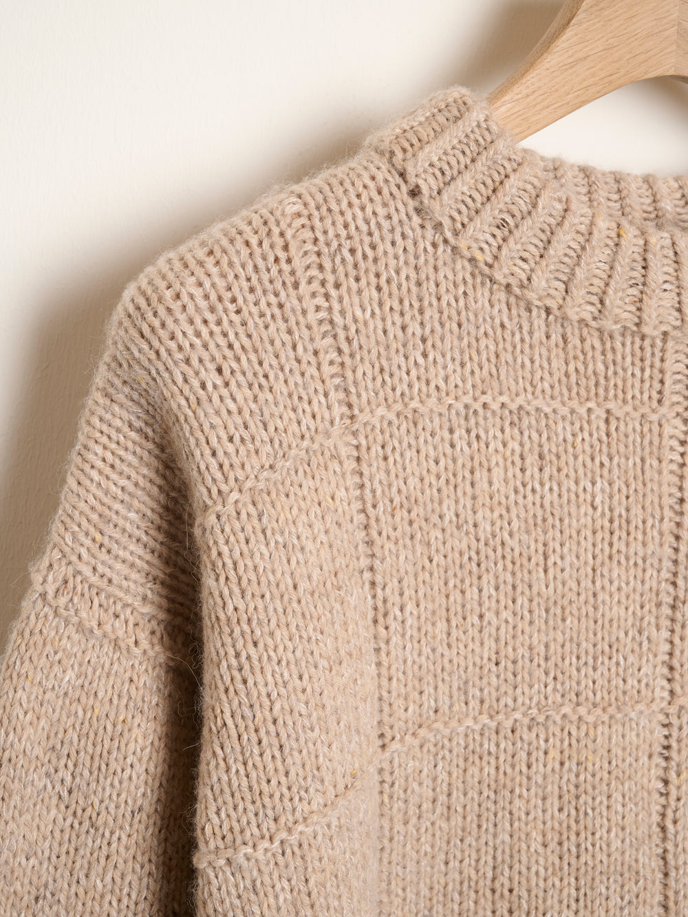 Damesweater med et simpelt, ternet strukturmønster, en lille halskant og drejet rib som særlig detalje. Trøjens ryg og forstykke strikkes nedefra og op, mens ærmerne strikkes oppefra og ned.
