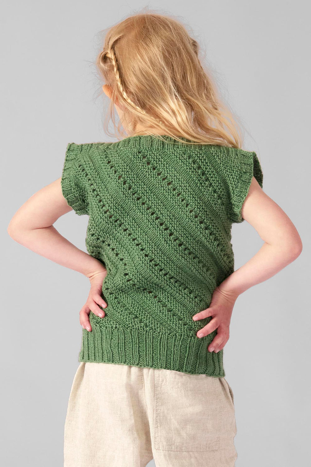 Asta toppen er en ærmeløs top, hvor både for- og bagstykket strikkes i et diagonalt mønster. Kanterne afsluttes i rib.