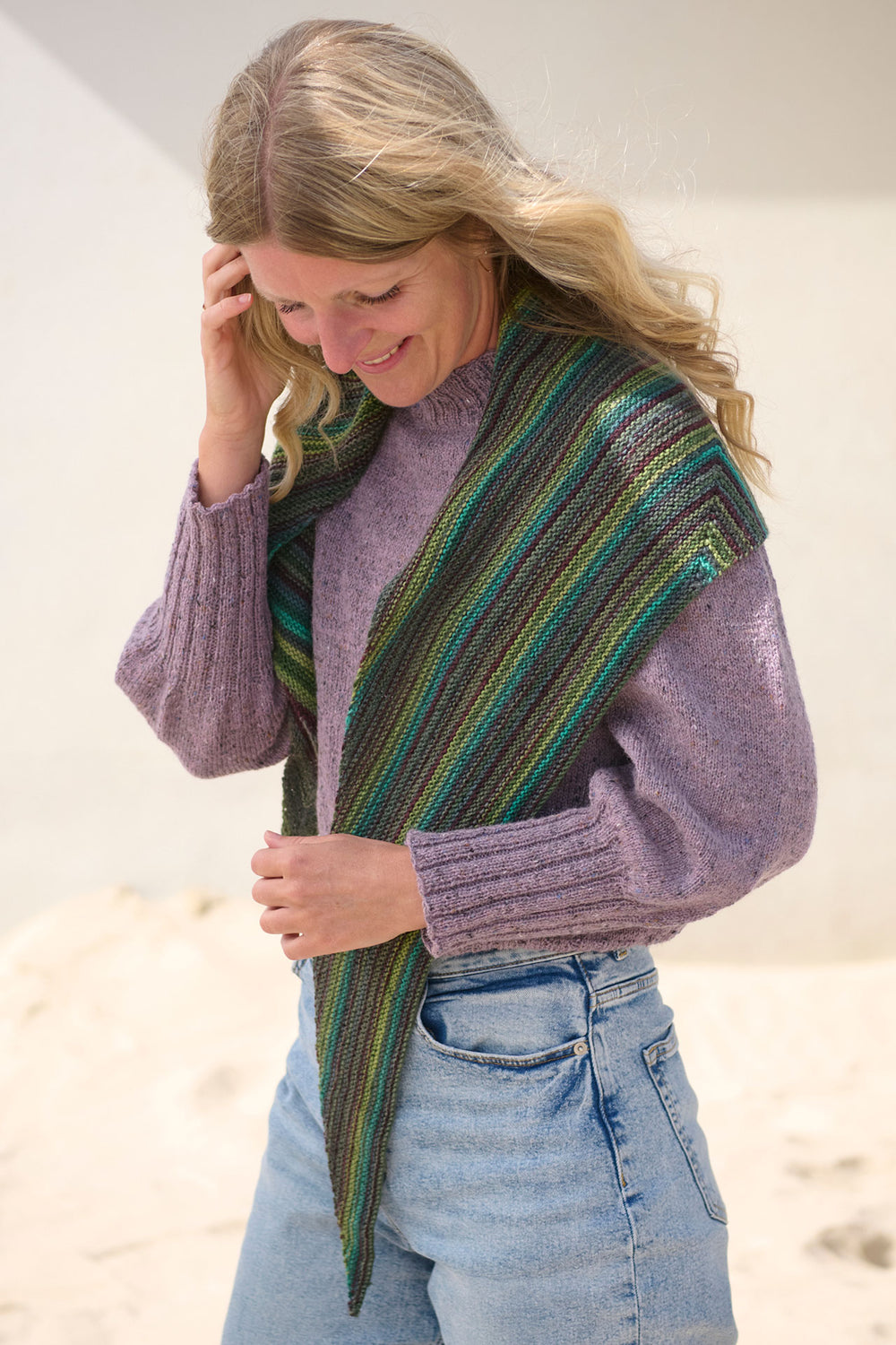 Sock Wool fås i flere forskellige serier, hvor det asymmetriske tørklæde er strikket i Ocean, som laver fine striber.