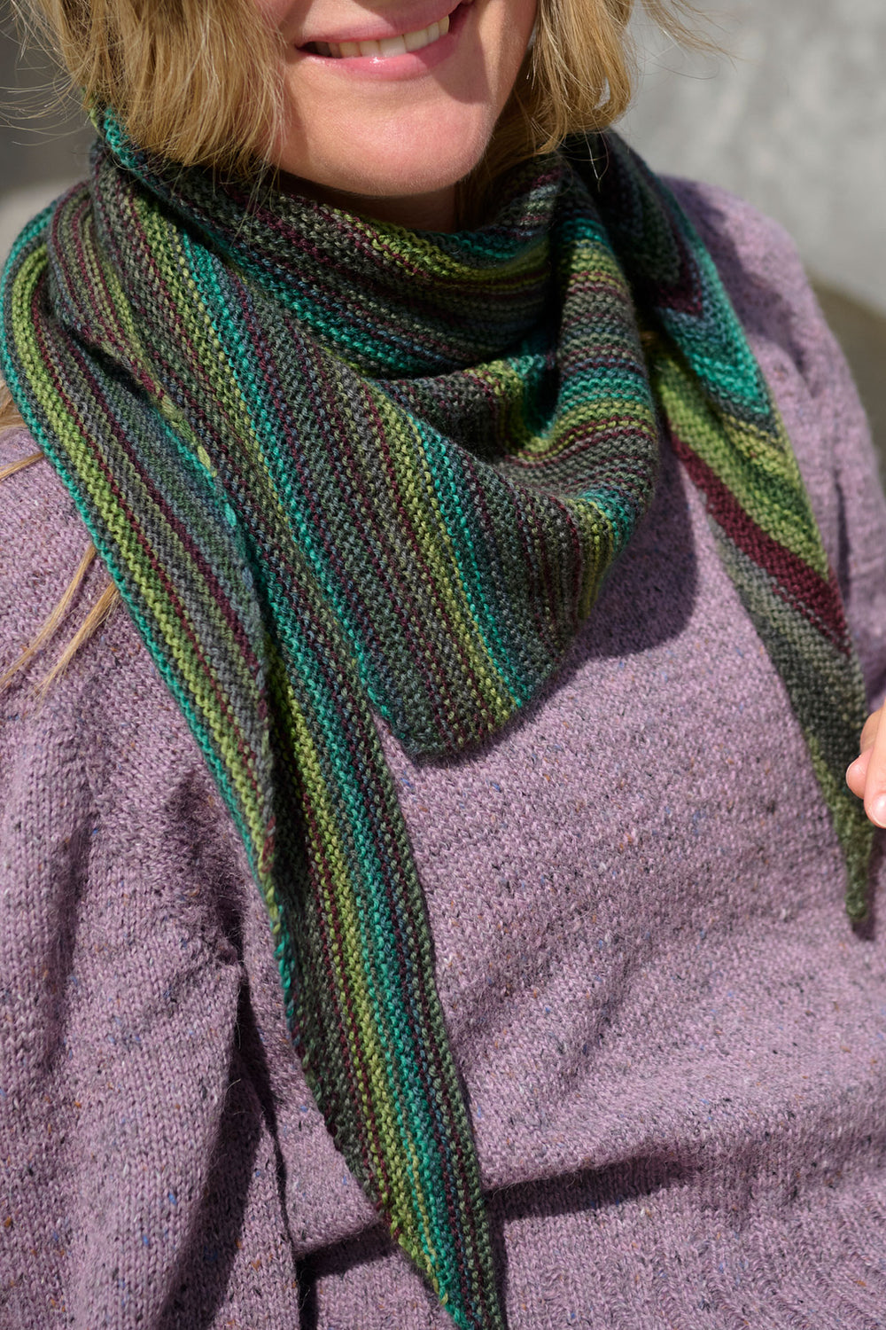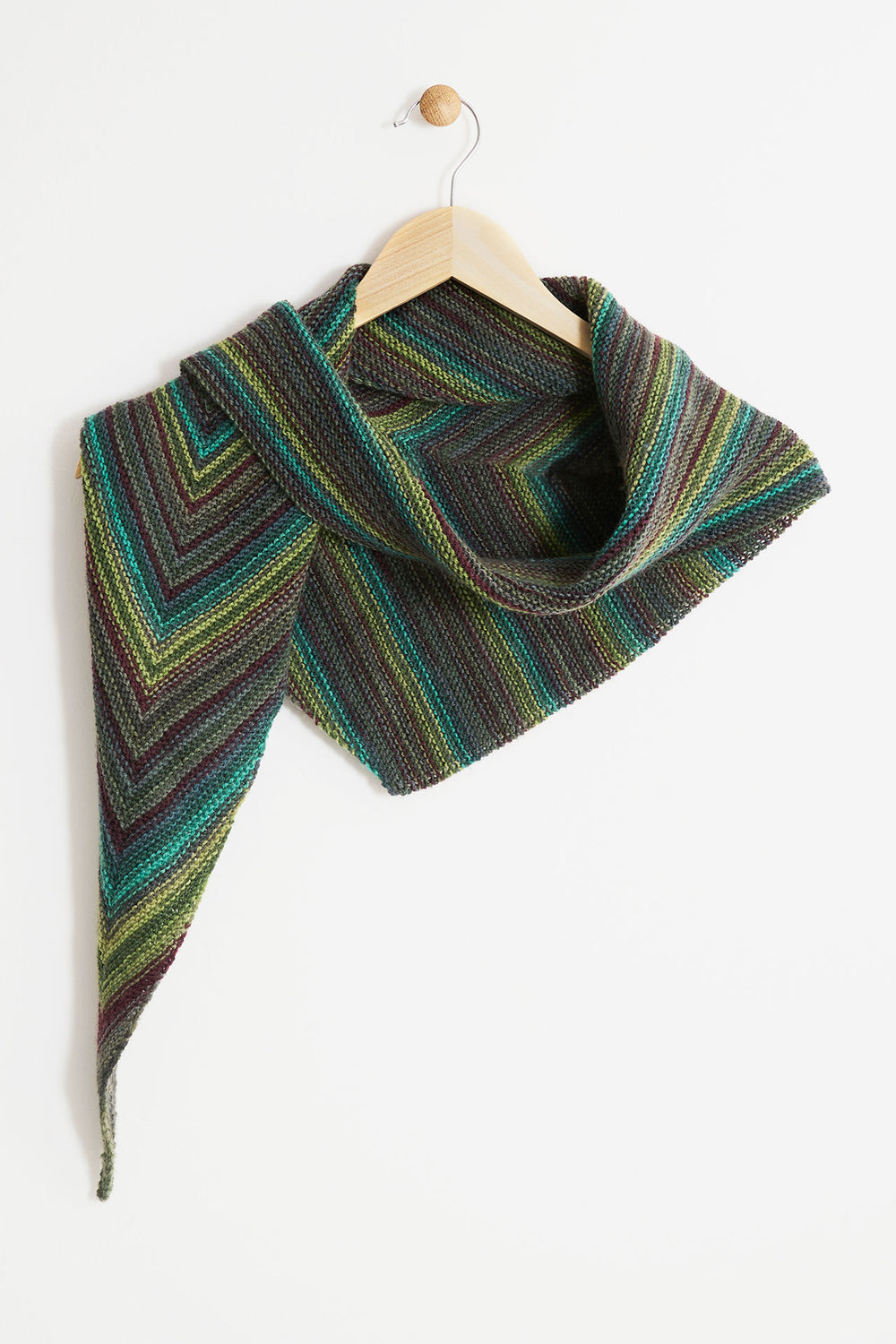 Det strikkede, trekantede tørklæde har en asymmetrisk facon, hvor det er bredere i en ene side. Det gør det derfor lidt anderledes at strikke, men det er samtidig også et enkelt og meget begyndervenligt strikkeprojekt. Og med farveskiftende garn som Mayflower Premium Sock Wool er det spændende undervejs at følge det skiftende farveforløb.
