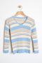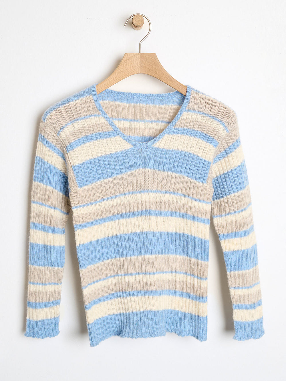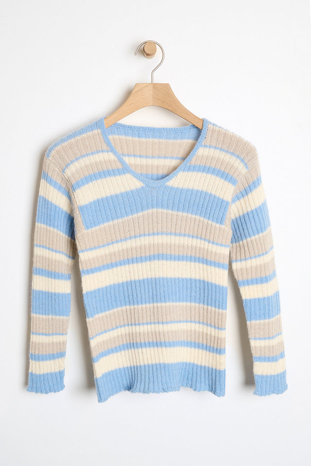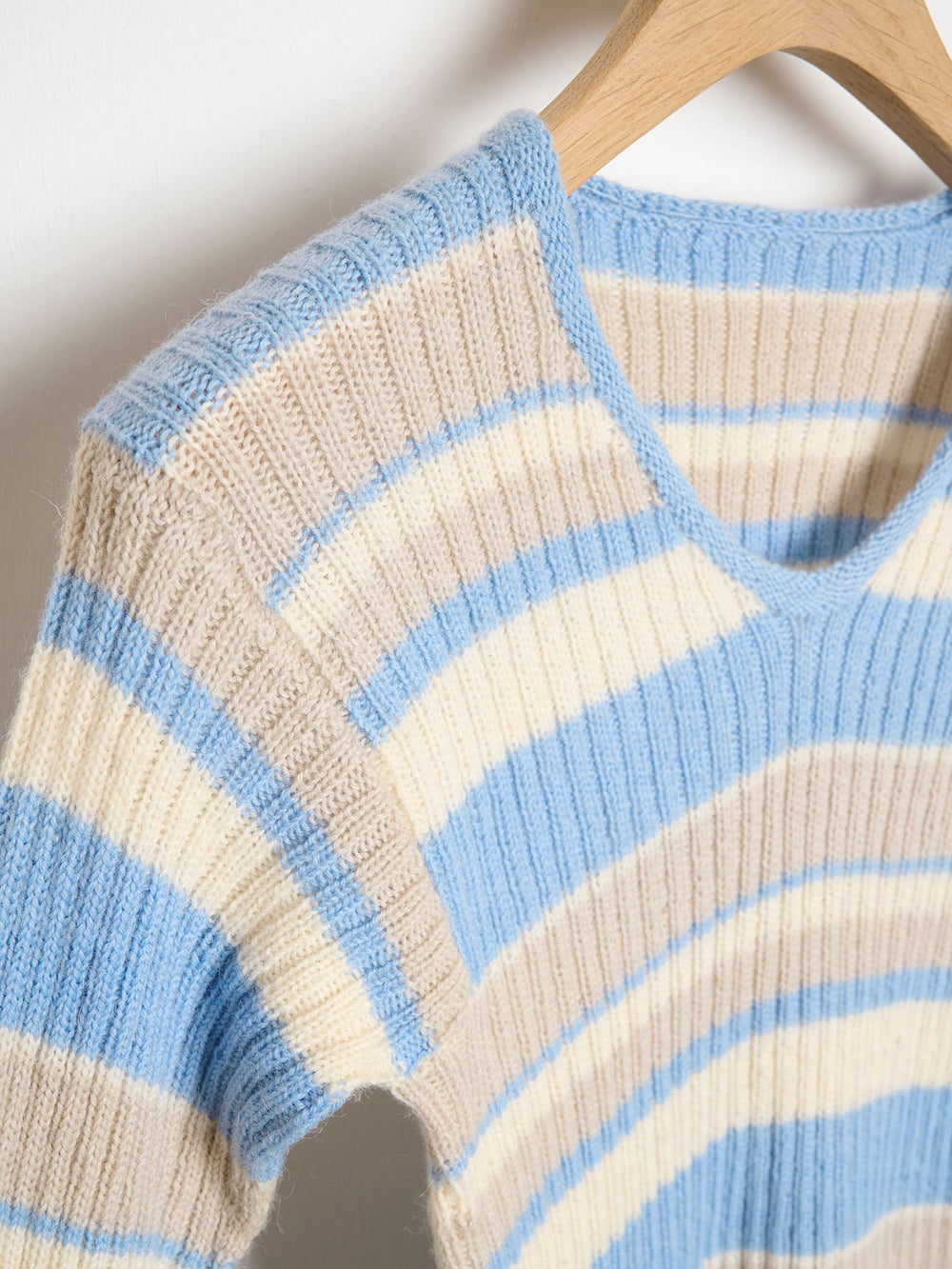 Blusen er ribstrikket, hvilket giver flotte, lodrette strukturstriber. Samtidig hjælper ribmønsteret også med at forme blusen, så den følger taljen på en klædelig måde. Disse detaljer er kombineret med det fine stribemønster i havblå, hvid og sandfarvet med striber i forskellig bredde.