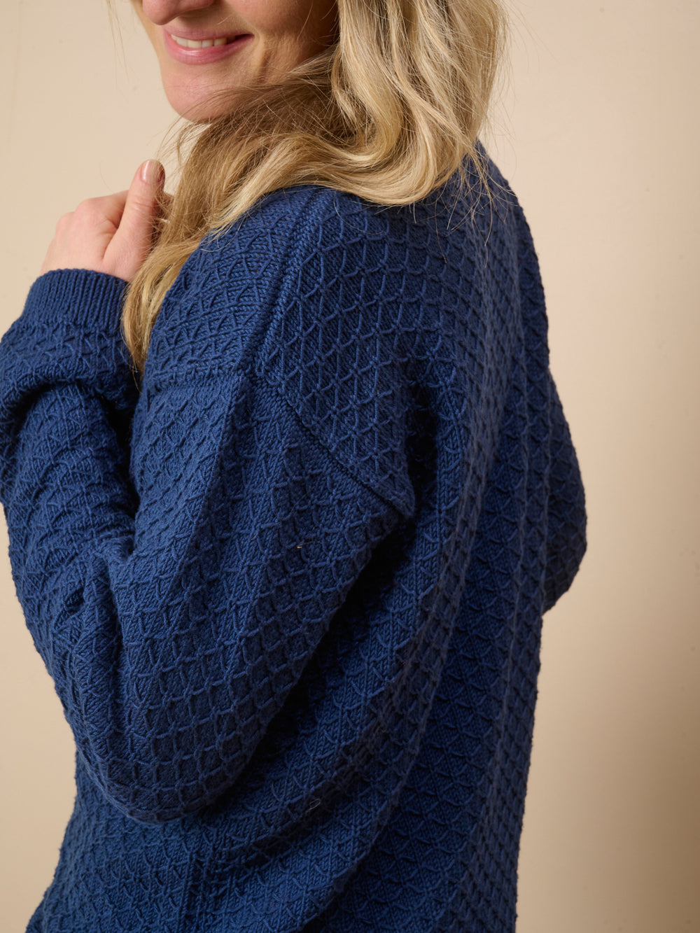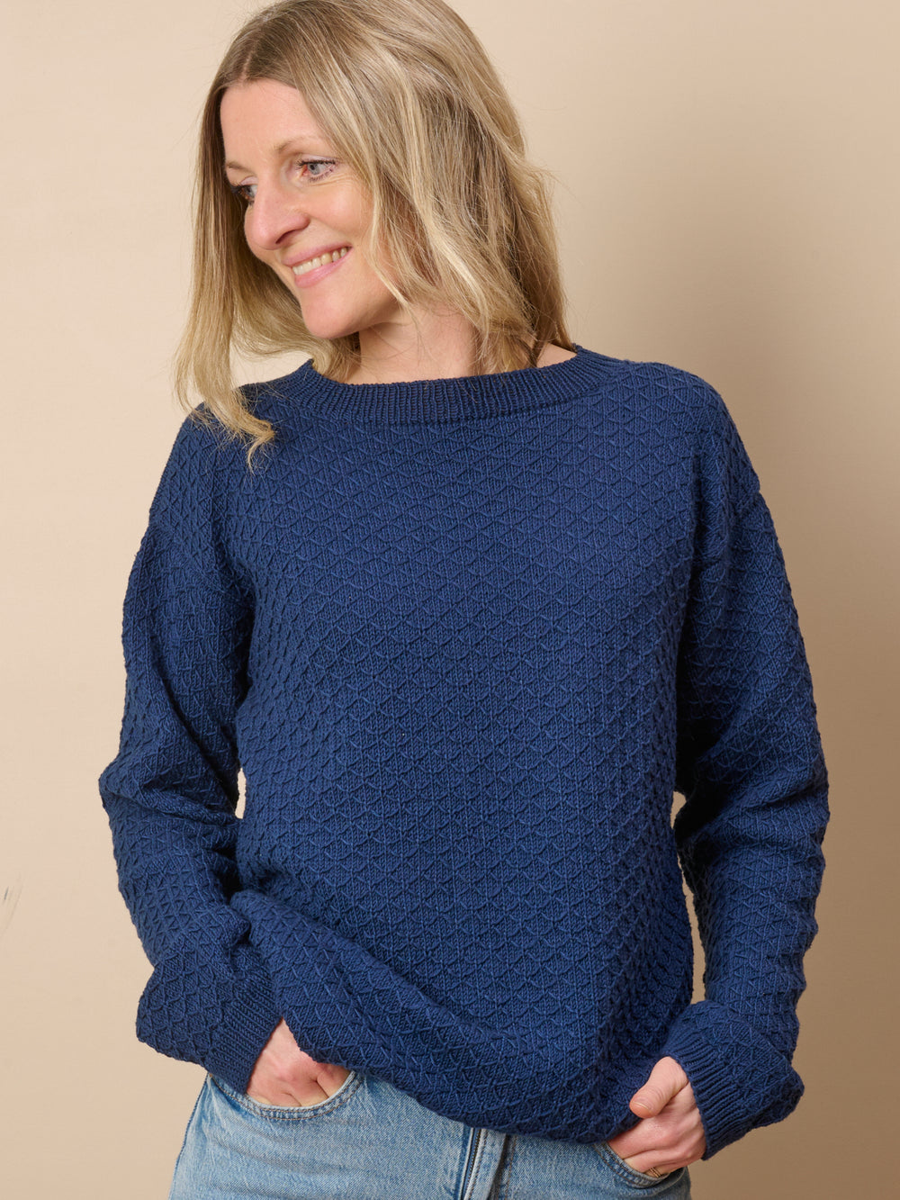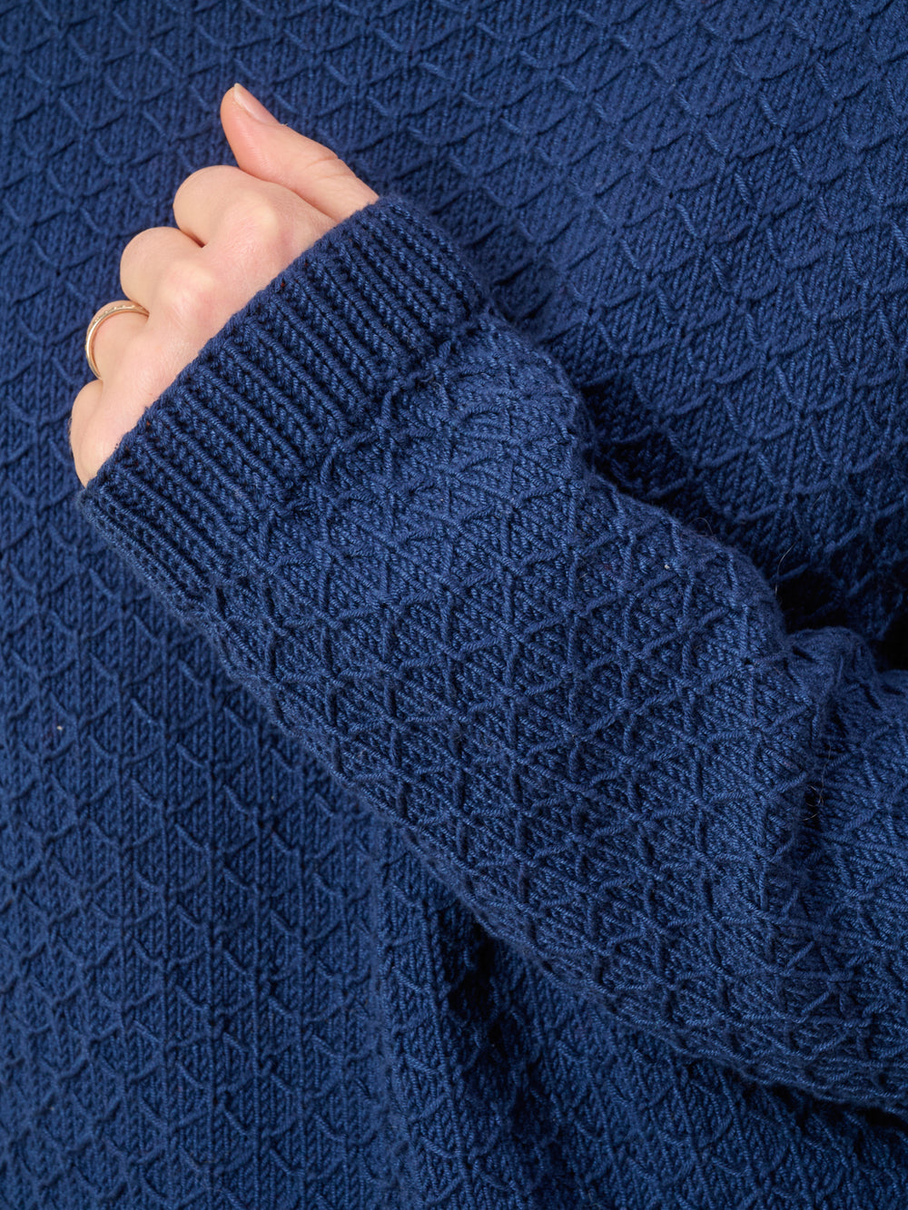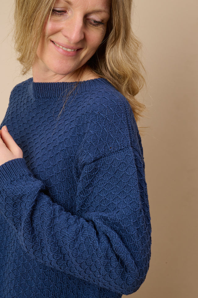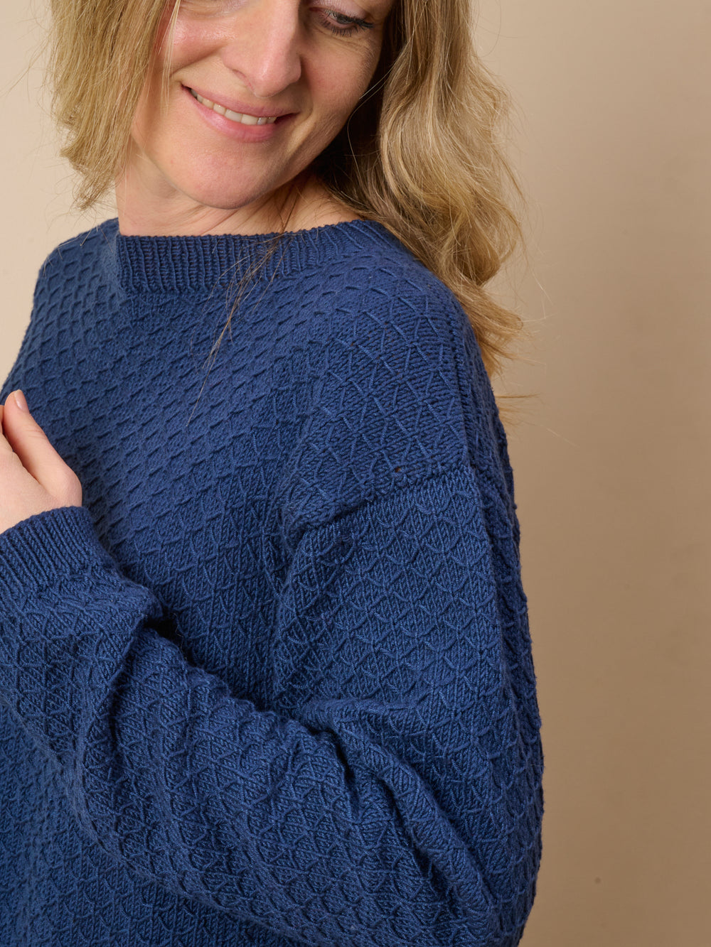 Den bløde Ava bluse strikkes i et fint og enkelt mønster, som giver et smukt resultat. For- og bagstykke strikkes for sig nede fra og op. Ærmerne strikkes også nedefra og op, indtil ærmerne har den ønskede længde. Delene sys sammen, og der strikkes derefter masker op i halsen til en ribstrikket halskant. Opskriften guider dig godt igennem det diskrete mønster.