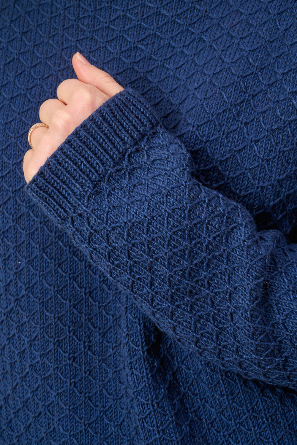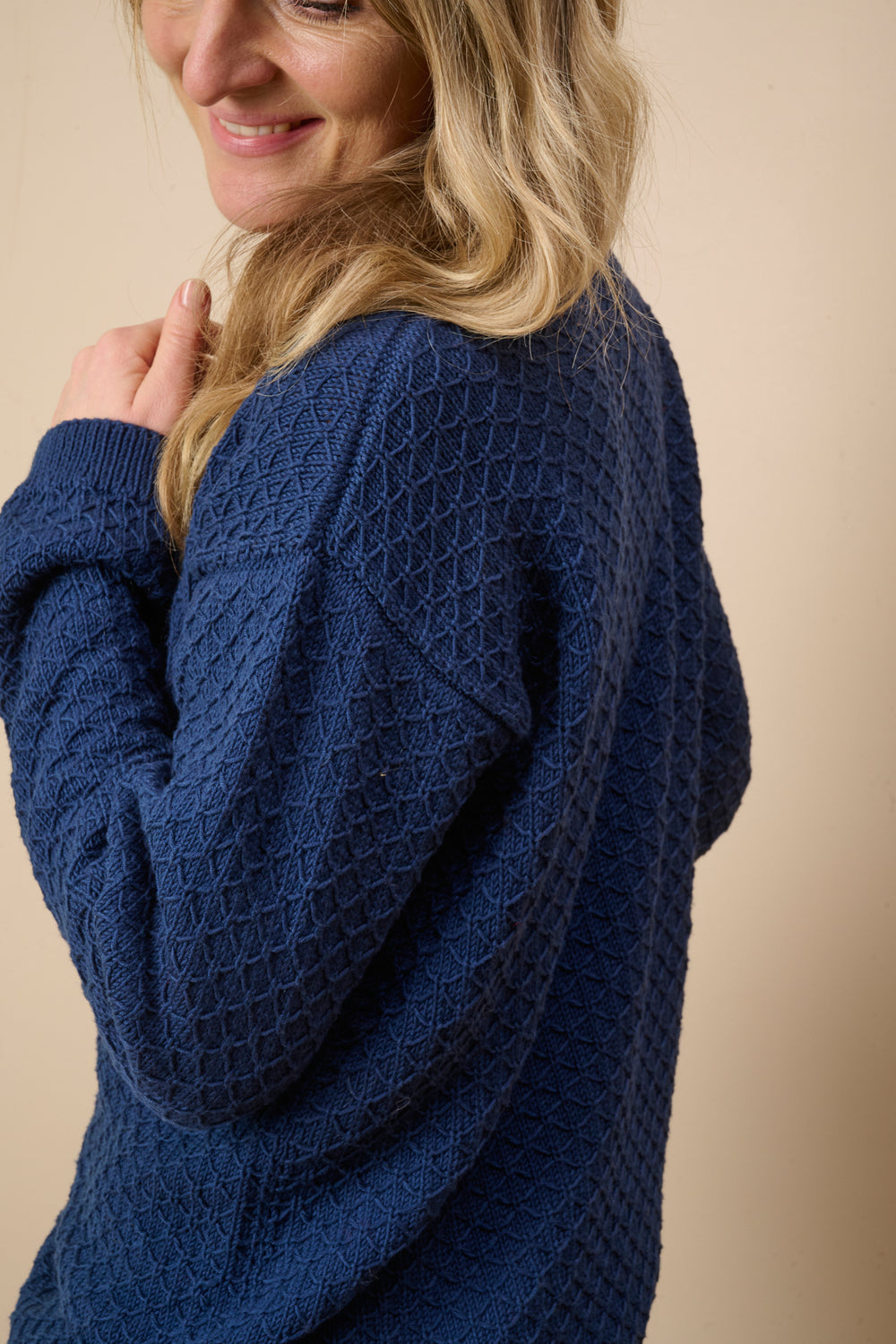 Den bløde Ava bluse strikkes i et fint og enkelt mønster, som giver et smukt resultat. For- og bagstykke strikkes for sig nede fra og op. Ærmerne strikkes også nedefra og op, indtil ærmerne har den ønskede længde. Delene sys sammen, og der strikkes derefter masker op i halsen til en ribstrikket halskant. Opskriften guider dig godt igennem det diskrete mønster.