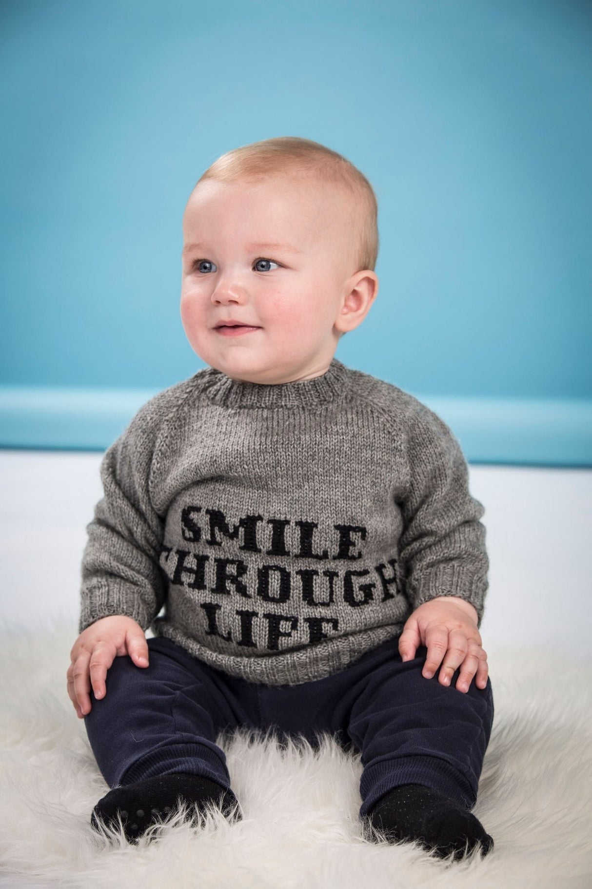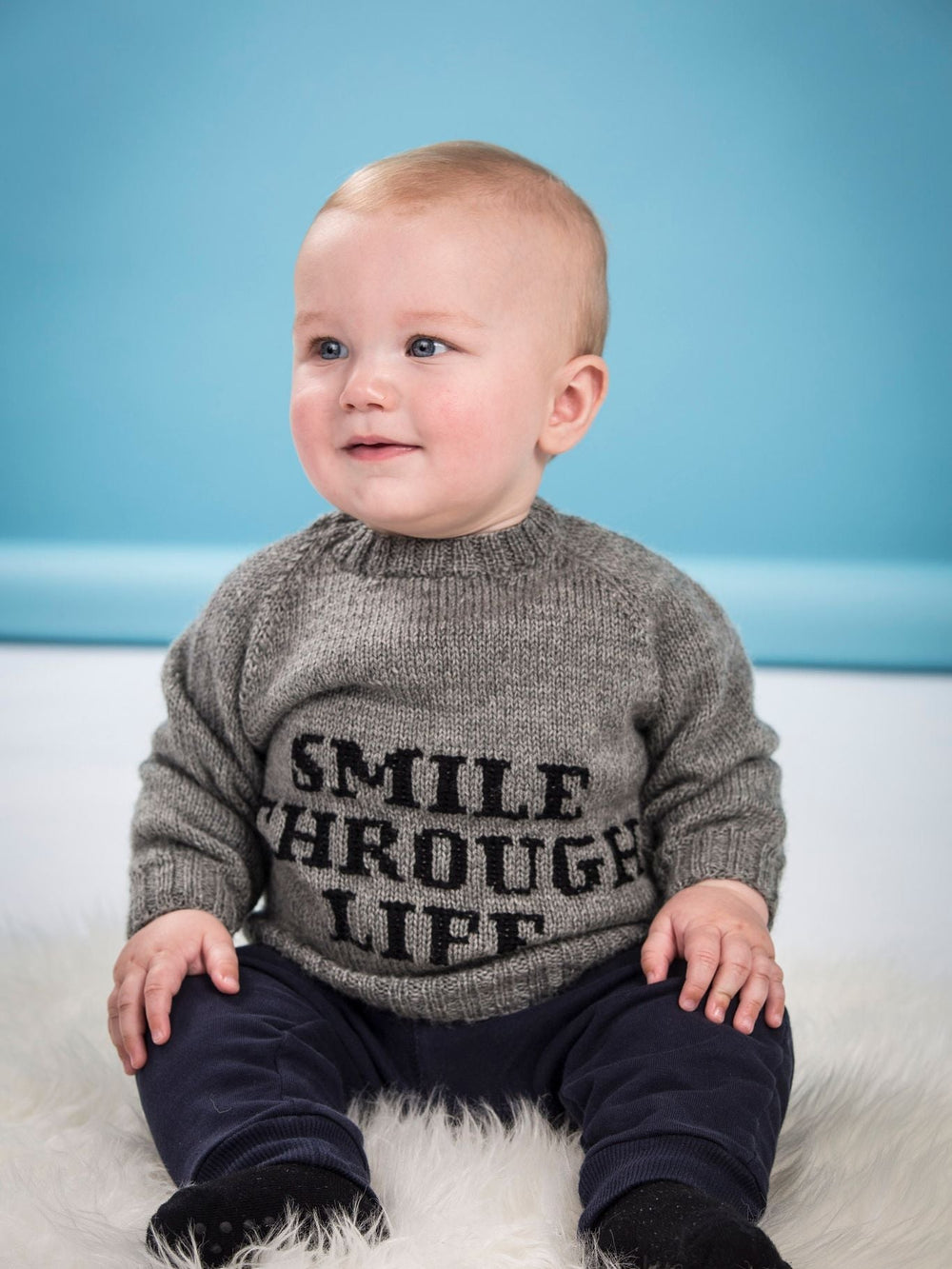 Selve sweateren er ganske enkel, mens sweaterens forside bærer citatet: 'SMILE THROUGH LIFE'. Sweateren er strikket med raglanærmer, hvilket giver en flot overgang mellem sweaterens ærmer og bærestykket.