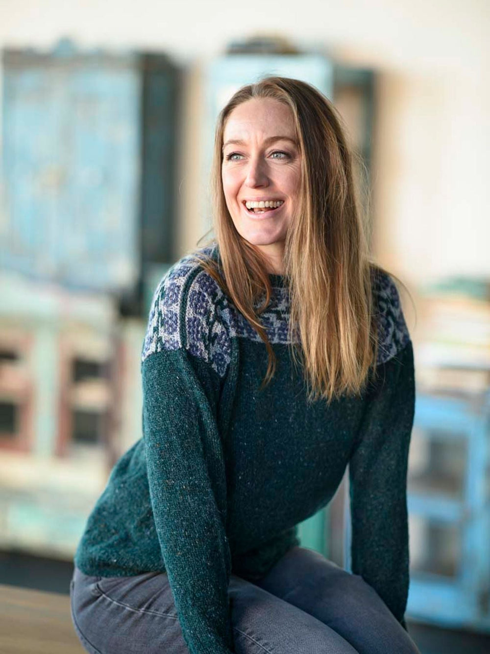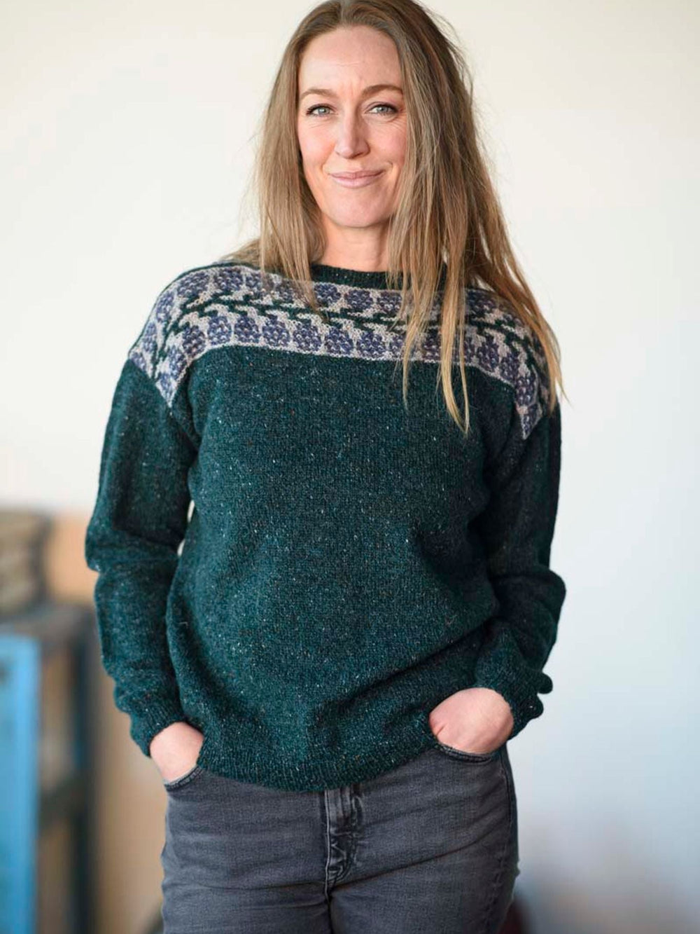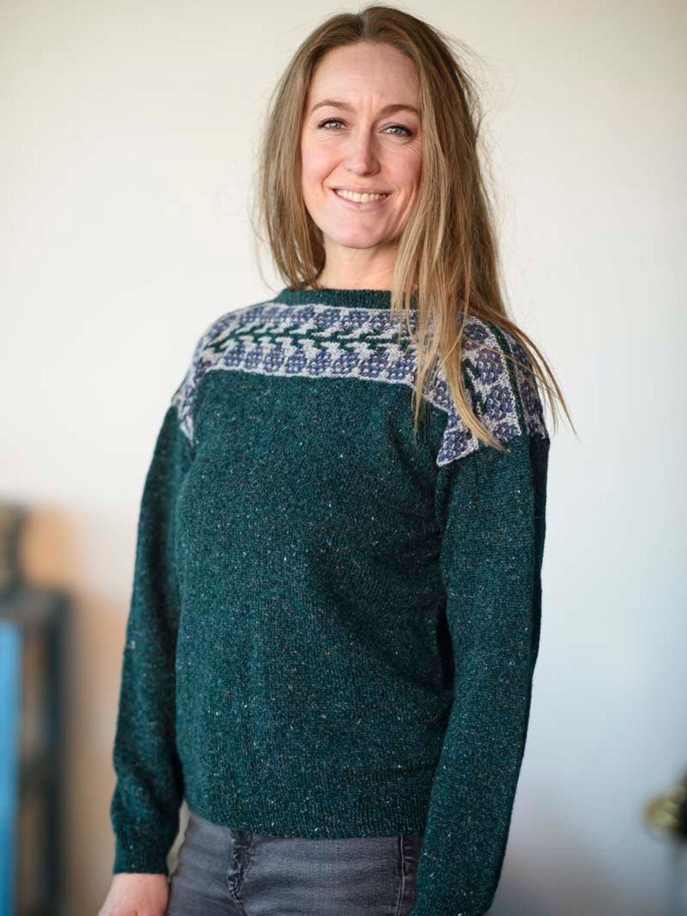 Bellis Sweater er en kunstfærdig sweater, der er strikket med en smuk mønsterbort, som gør sweateren helt unik.