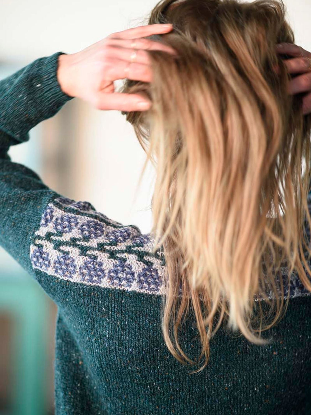 Tweednisterne tilføjer ekstra farvespil til sweaterens smukke mønsterbord, som strikkes med vævestrik og danner kontrast til resten af sweateren, der er glatstrikket.