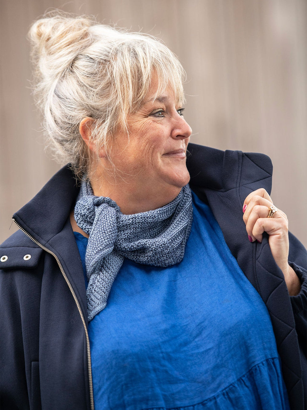 Tørklædet er oprindeligt strikket i Mayflower London Merino Fine. Opskriften finder du her.