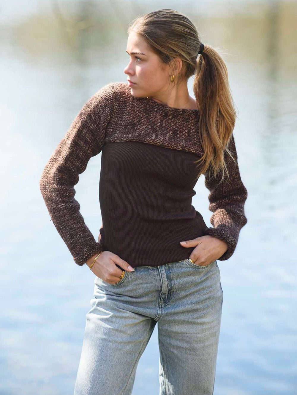 Sjælevarmeren strikkes i glatstrik fra ærme til ærme og er derfor underholdende at strikke.