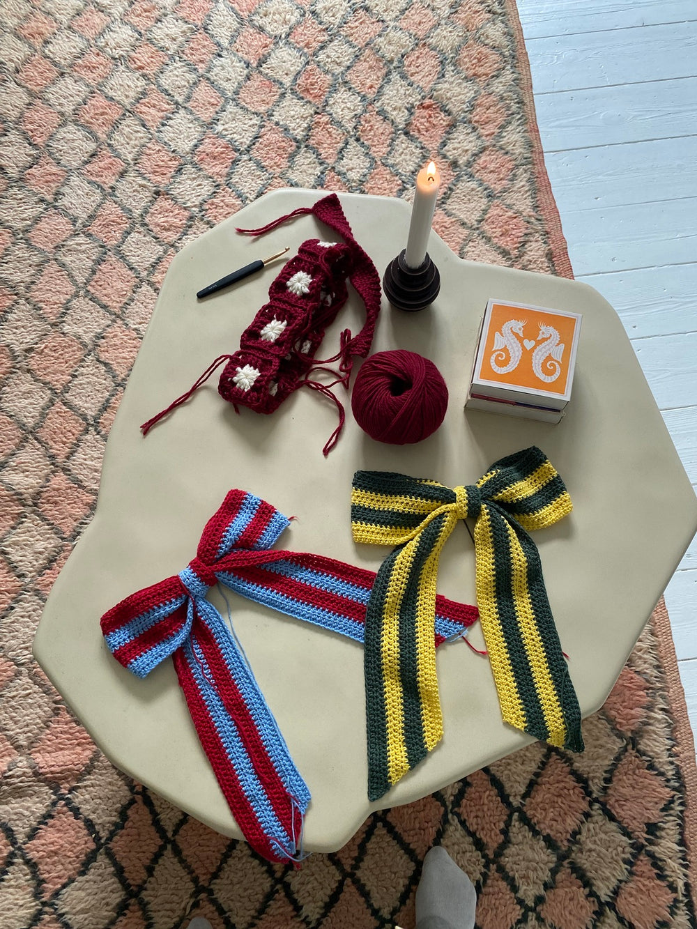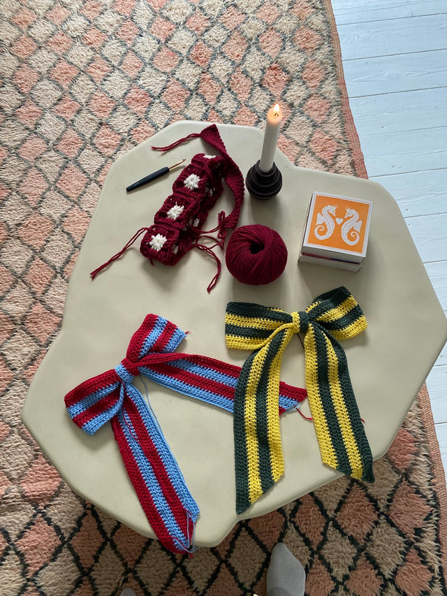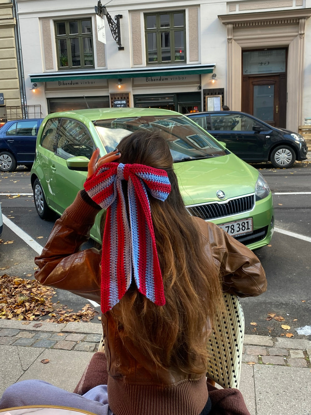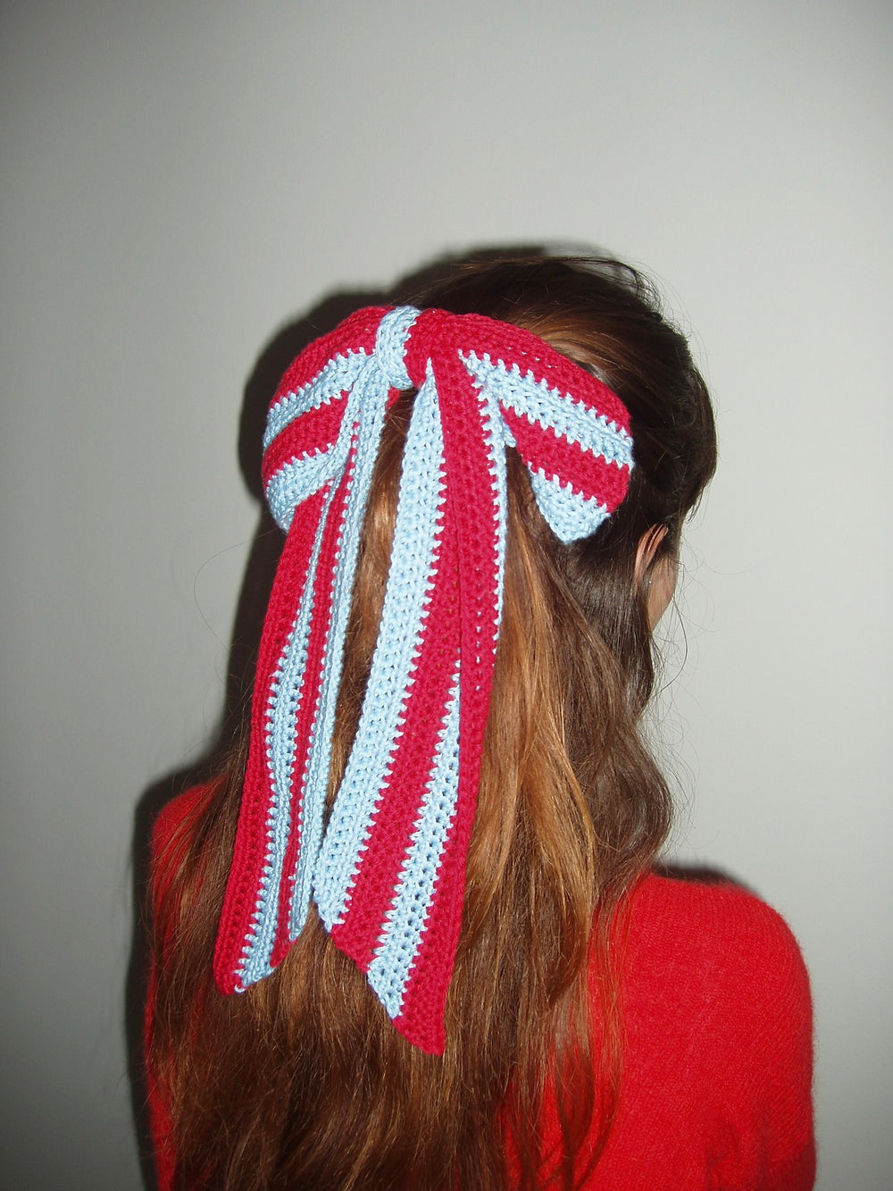 En hæklet sløjfe i bomuld til enten ophængning eller hårpynt. Størrelsen på sløjfen er 25 x 30 cm. Størrelsen kan justeres, det står i opskriften hvordan.