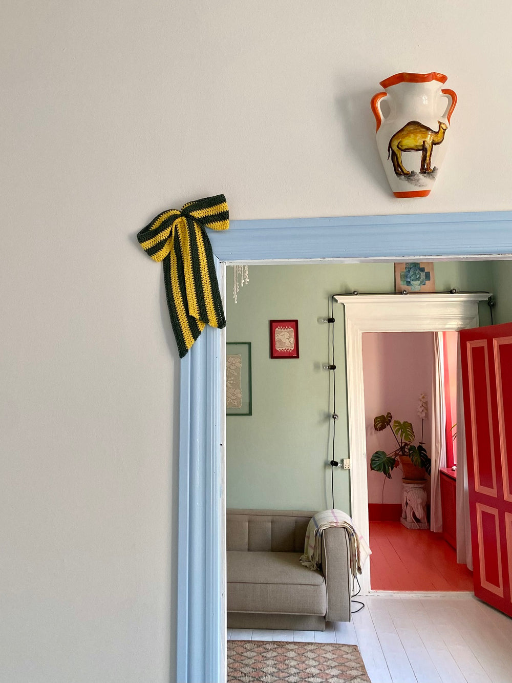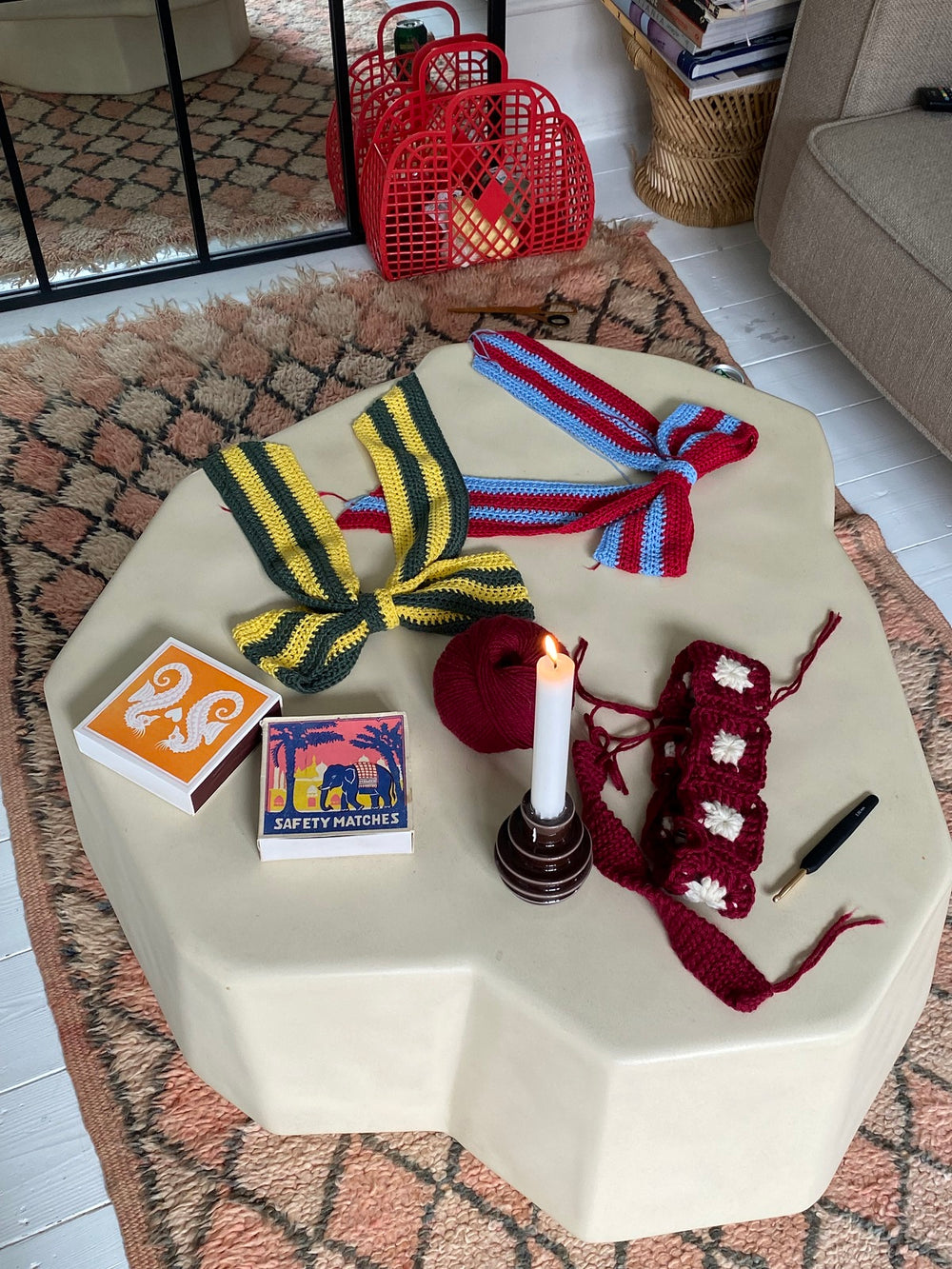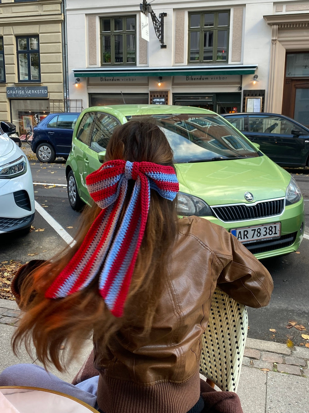 En hæklet sløjfe i bomuld til enten ophængning eller hårpynt. Størrelsen på sløjfen er 25 x 30 cm. Størrelsen kan justeres, det står i opskriften hvordan.