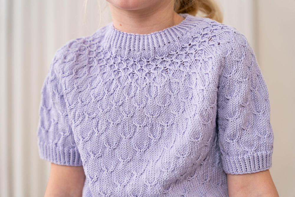 Birdie tee junior er en virkelig smuk, kortærmet bluse, som har et flot snit og et gennemgående strukturmønster. Ved halsåbning, ærmekanter og den nederste kant er der strikket rib med drejet ret og vrang, hvilket giver en flot og markeret ribkant. Blusen strikkes nedefra og op til ærmegabet. Derefter strikkes hvert ærme for sig, hvorefter arbejdet samles på en rundpind og færdiggøres med et rundt bærestykke. Du bliver guidet godt igennem opskriften af diagram, hvorefter designet er overskueligt at kaste sig over.