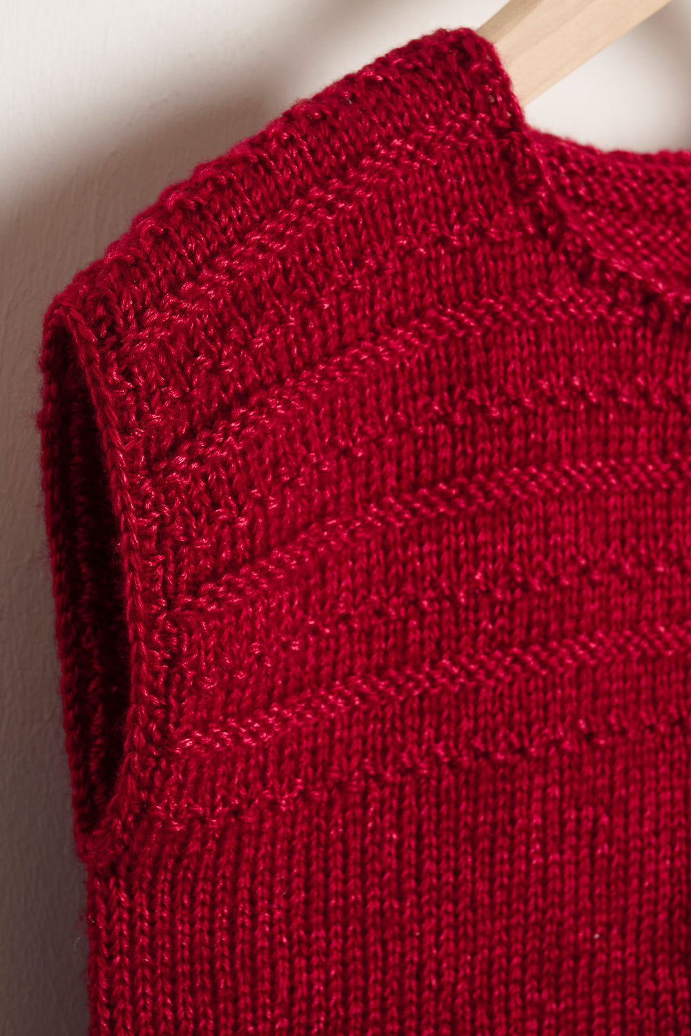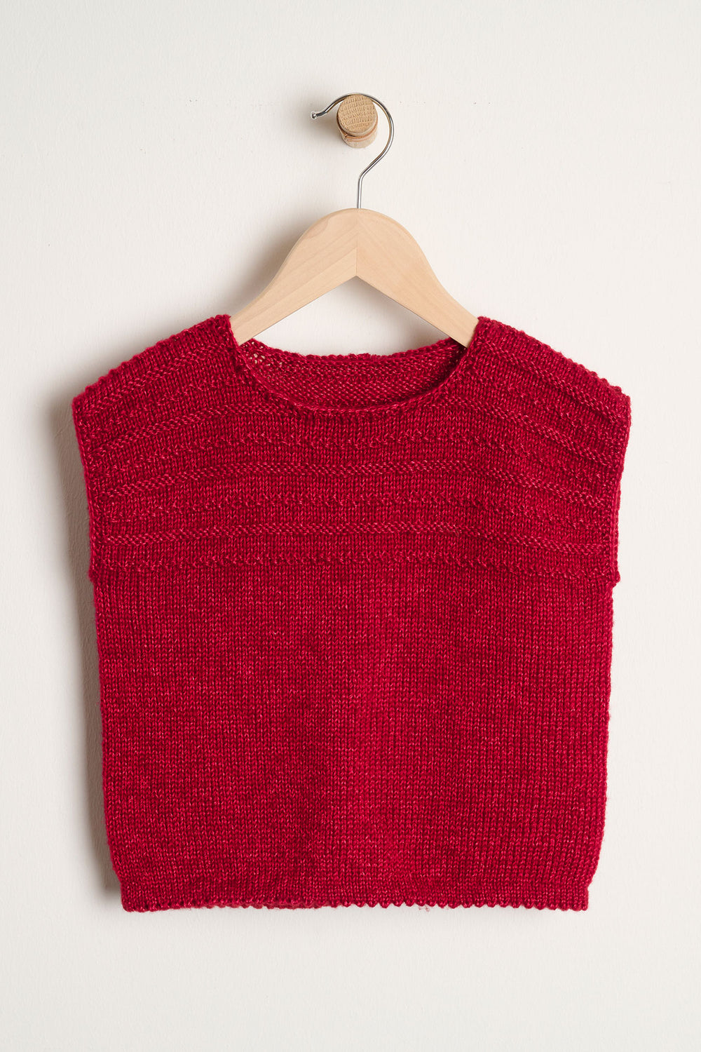 Fin og enkel top, som strikkes med et simpelt strukturmønster i bærestykket. Et mønster, som danner en fin kontrast til toppens glatstrik, og som går igen på både for- og bagstykke. Toppen strikkes nedefra og op med 2 tråde og har en flot afslutning i bunden i form af en takket kant.
