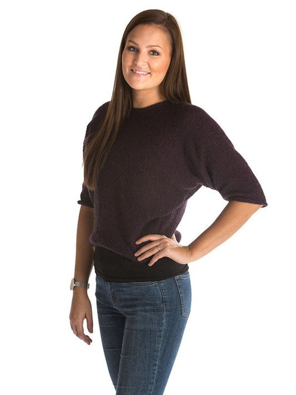 En feminin og pæn trøje, som er strikket på tværs med flotte flagermusærmer i 3/4-længde.