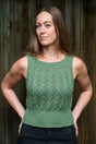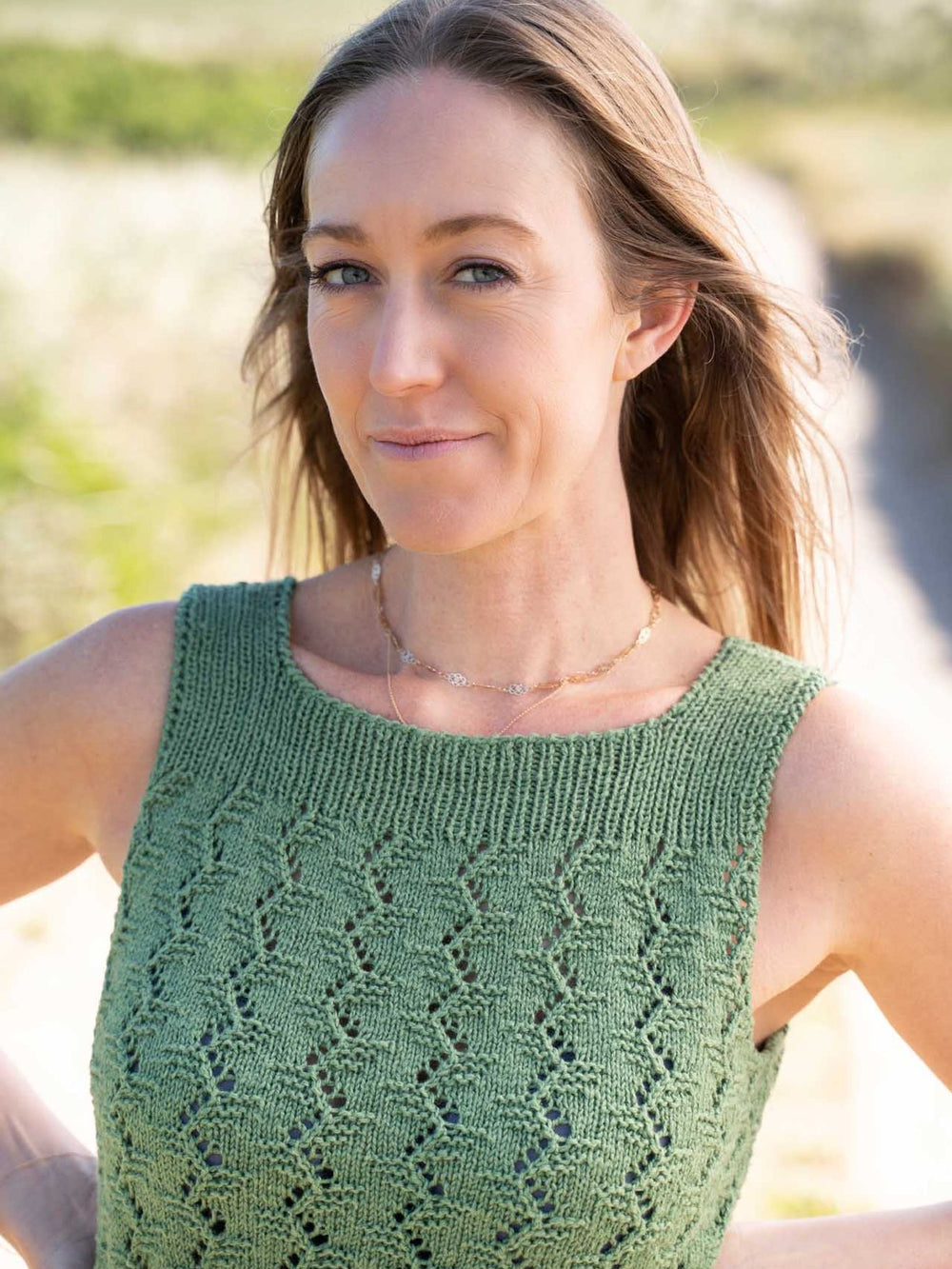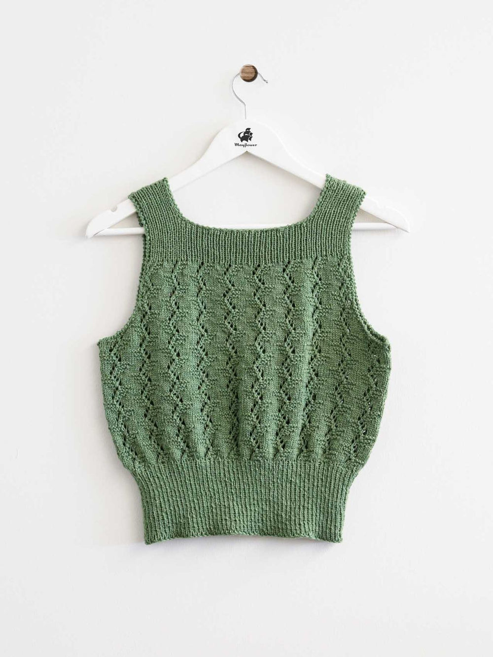 Toppen strikkes nedefra og op med en bred ribkant, ligesom bærestykket og stropperne også strikkes i rib. Det flotte hulmønster bliver skabt med ret- og vrangmasker. Så kan du følge et diagram, er det intet problem at kaste dig over denne fine sommertop. Toppen sluttes flot af med hæklede krebsemasker rundt langs halskanten og i ærmegabene.