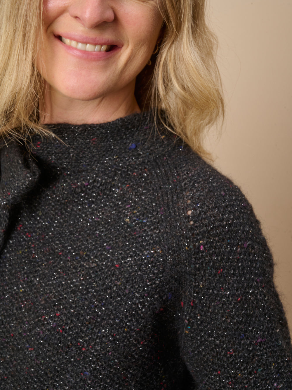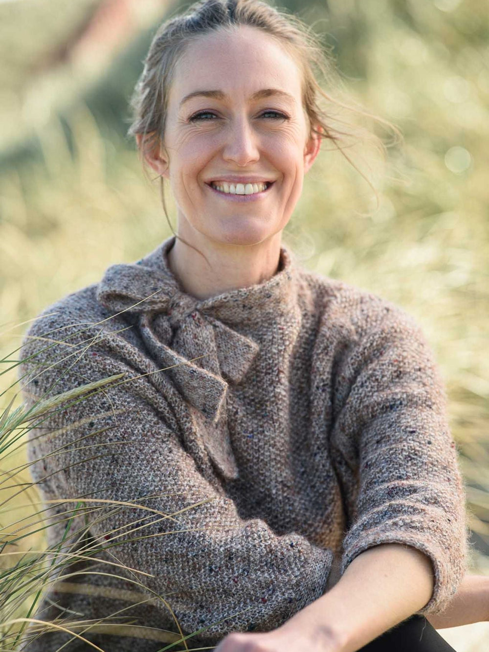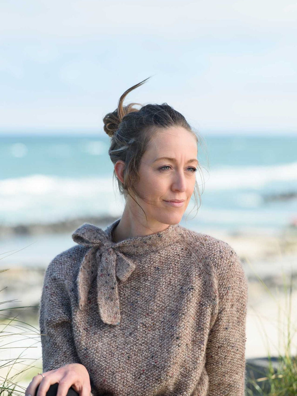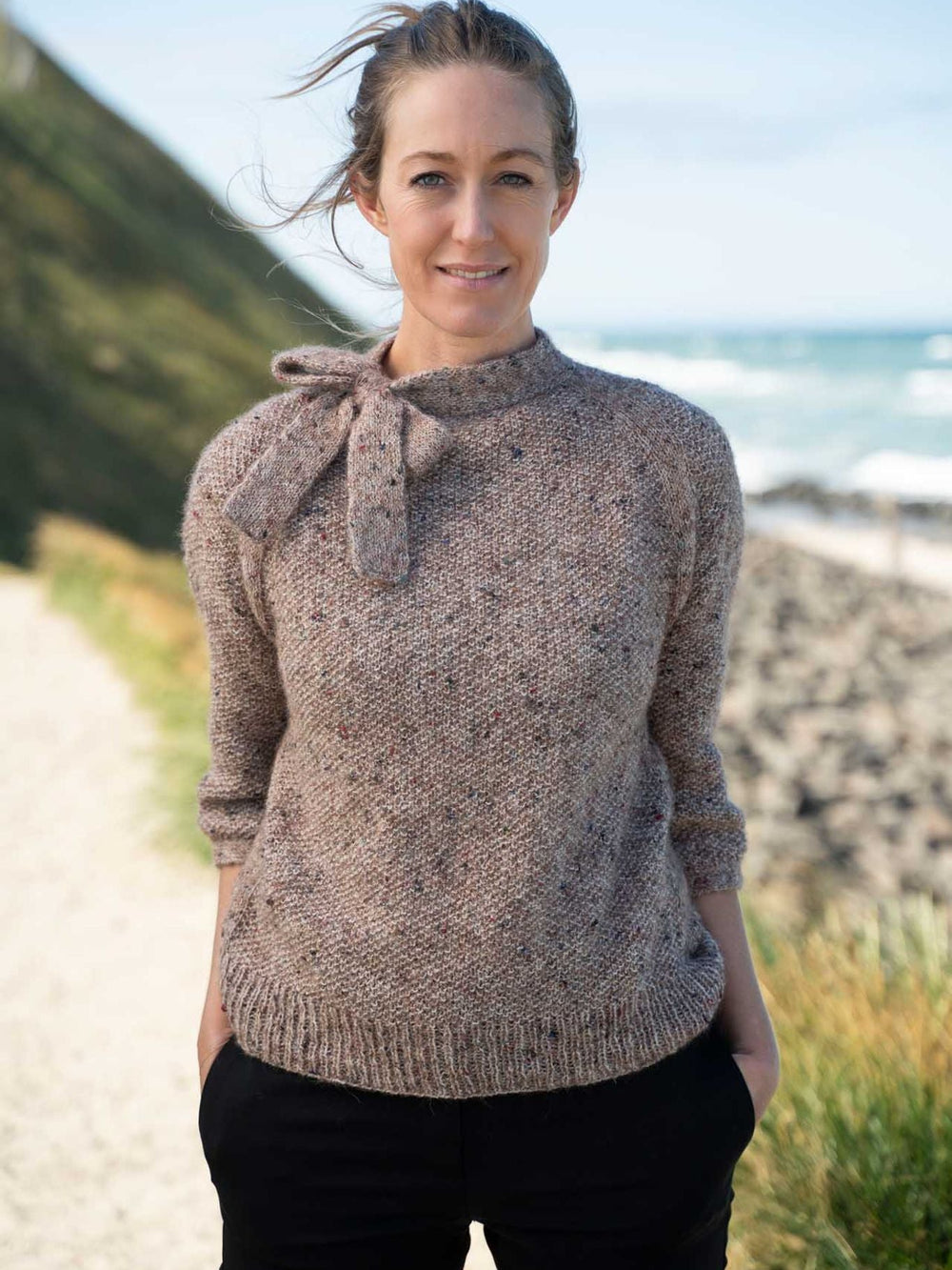 Trøjen er strikket oppefra og ned, så der ikke er behov for montering. Det giver et flot og sammenhængende udseende, når der ikke er syninger, hvilket bidrager til det elegante udseende. Selve trøjen strikkes med raglanudtagninger og perlestrik, mens det elegante bindebånd i halsen er dobbeltstrikket for at give ekstra struktur, så det holder formen.