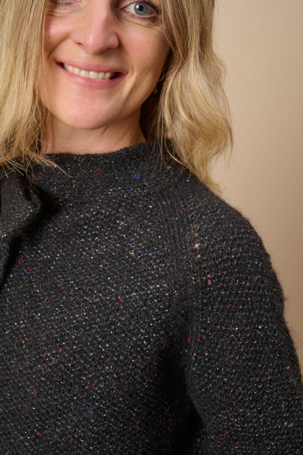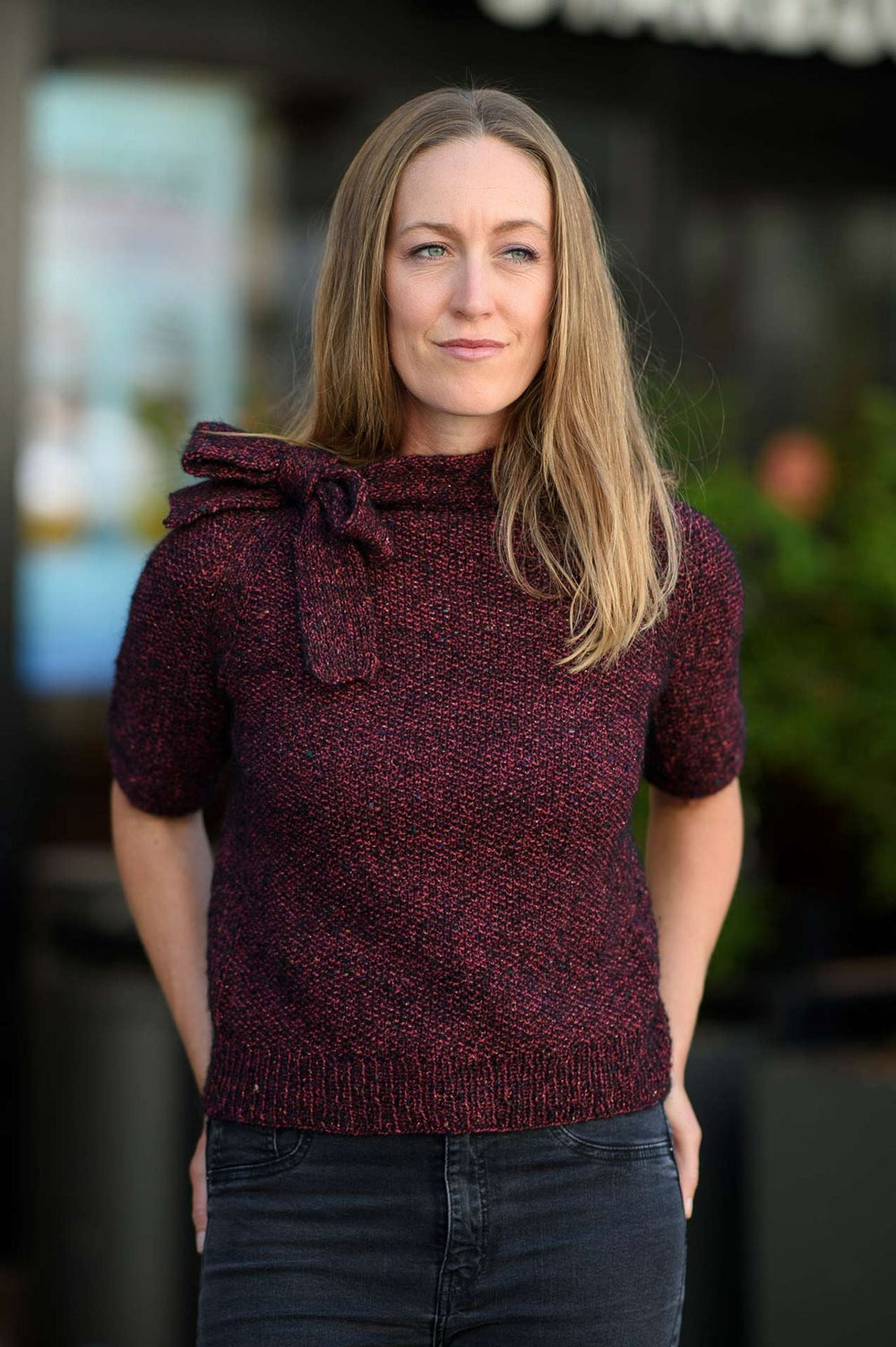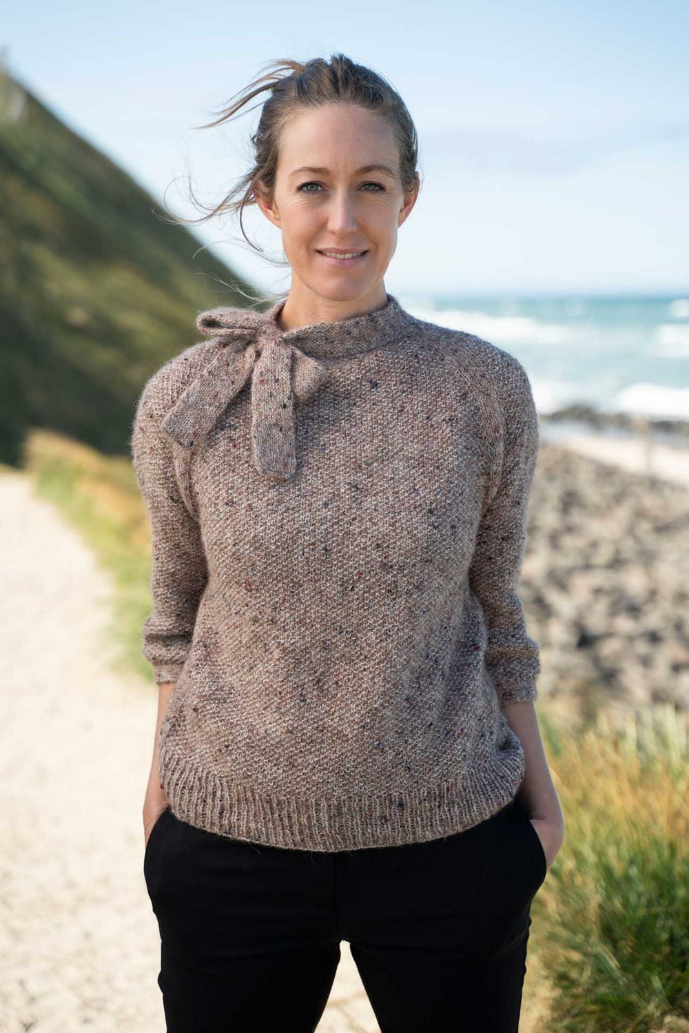 Trøjen er strikket oppefra og ned, så der ikke er behov for montering. Det giver et flot og sammenhængende udseende, når der ikke er syninger, hvilket bidrager til det elegante udseende. Selve trøjen strikkes med raglanudtagninger og perlestrik, mens det elegante bindebånd i halsen er dobbeltstrikket for at give ekstra struktur, så det holder formen.