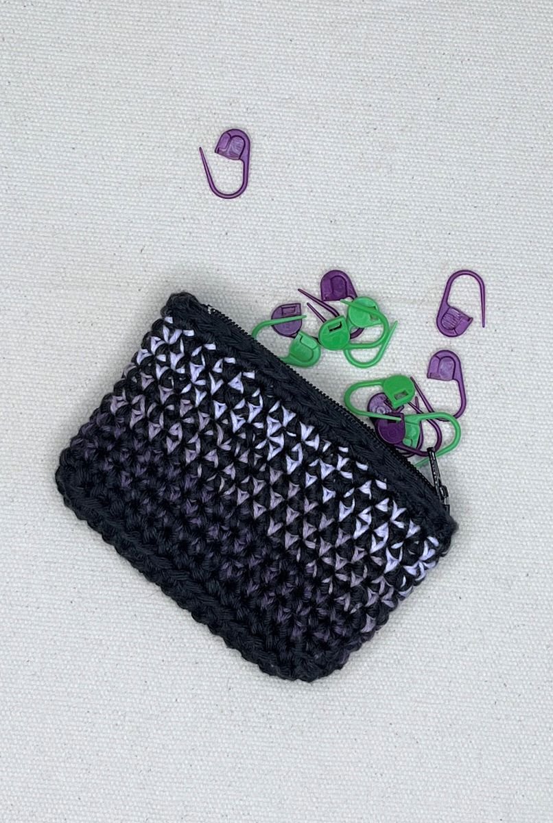 Lille hæklet pung, som du kan have i tasken til fx småmønter, maskemarkører el.lign., ligesom den også har en fin størrelse til børn. Med en størrelse på omkring 11 x 8 cm fylder den ikke meget i tasken, og lynlåsen sørger for at holde godt styr på indholdet. Pungens farvevalg skifter løbende igennem arbejdet.