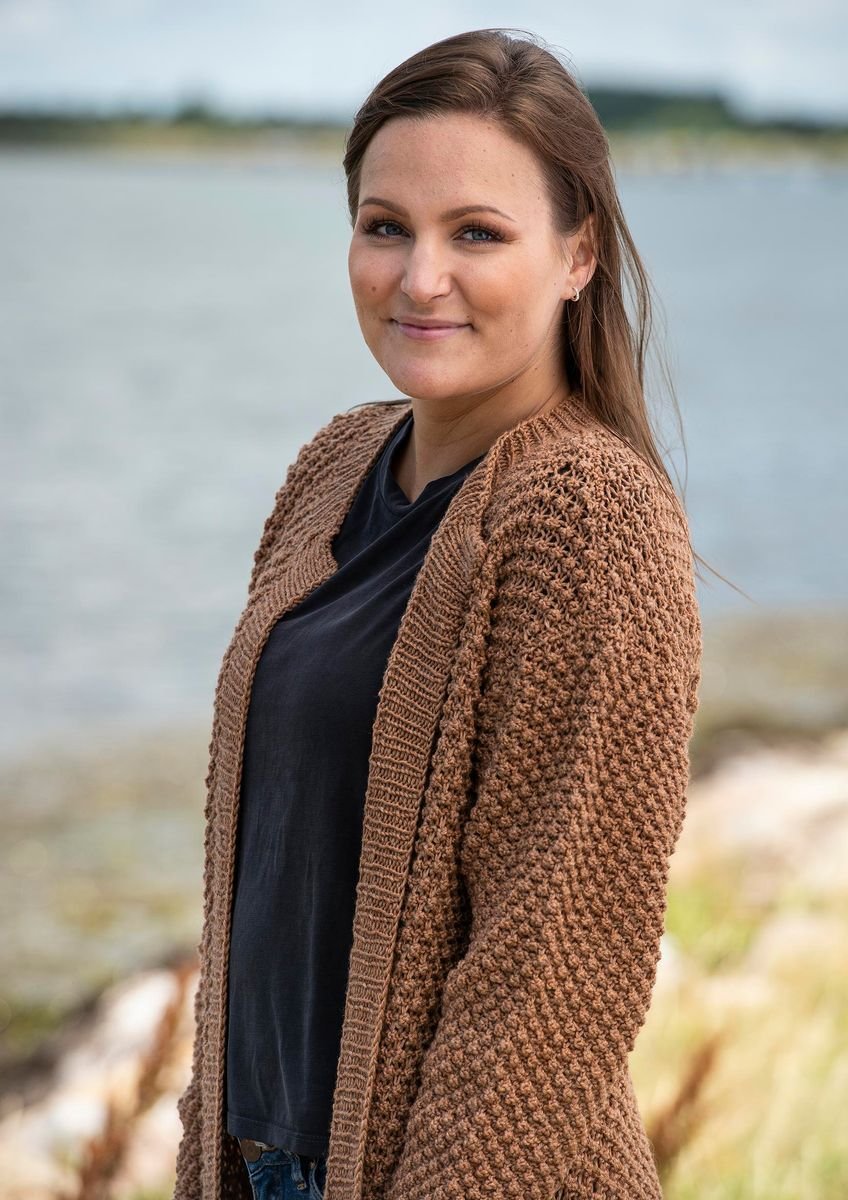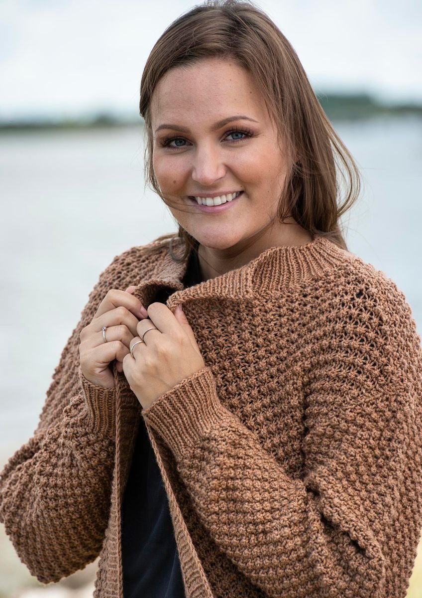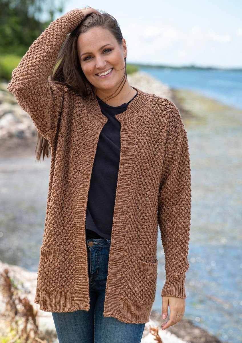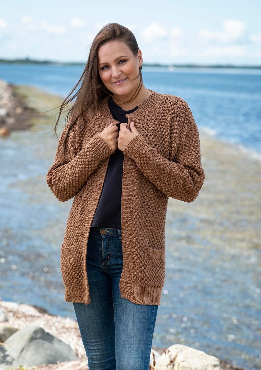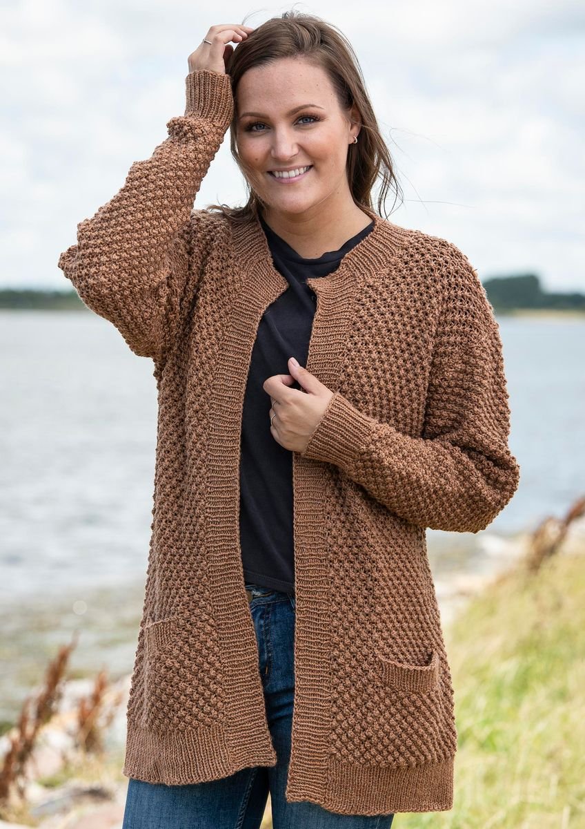 Denne cardigan har et klassisk look, som opnås ved at strikke med brombærmønster. Brombærmønsteret er en ufatteligt smuk strikketeknik, som også er med til at give den færdige cardigan mere fylde og stor detaljerighed. Selve cardiganen er forholdsvis enkel, og det er værd at bemærke de isatte lommer, som har indvendige lommeposer. Disse fremhæves af en lille ribkant, som passer godt til brombærmønsteret.