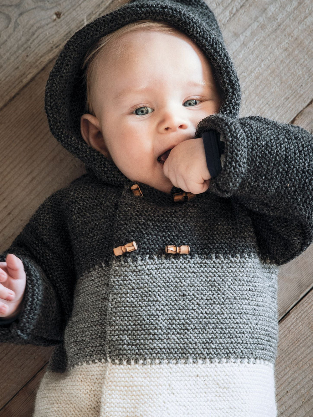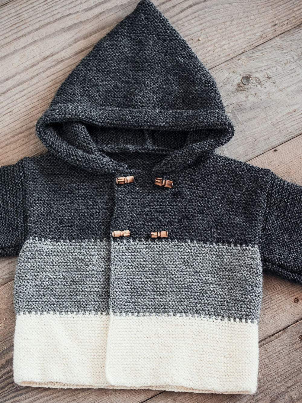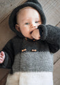 Fin hættetrøje til de mindste, som er strikket i tre forskellige farver og monteret med knapper. Ved hvert farveskifte er der en flot, takket overgang, som gør, at farverne blender flot sammen.