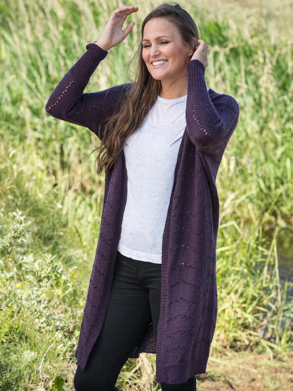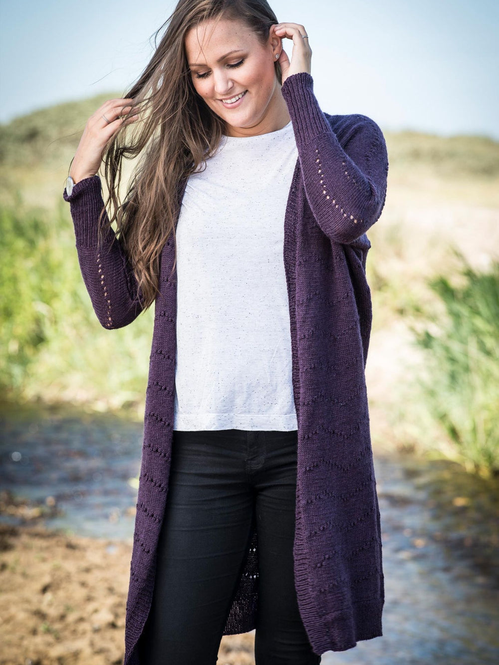 Cardiganen har et enkelt hulmønster, som er lavet til at danne små bølger med en enkel og diskret effekt. Det samme mønster går igen på ærmerne.