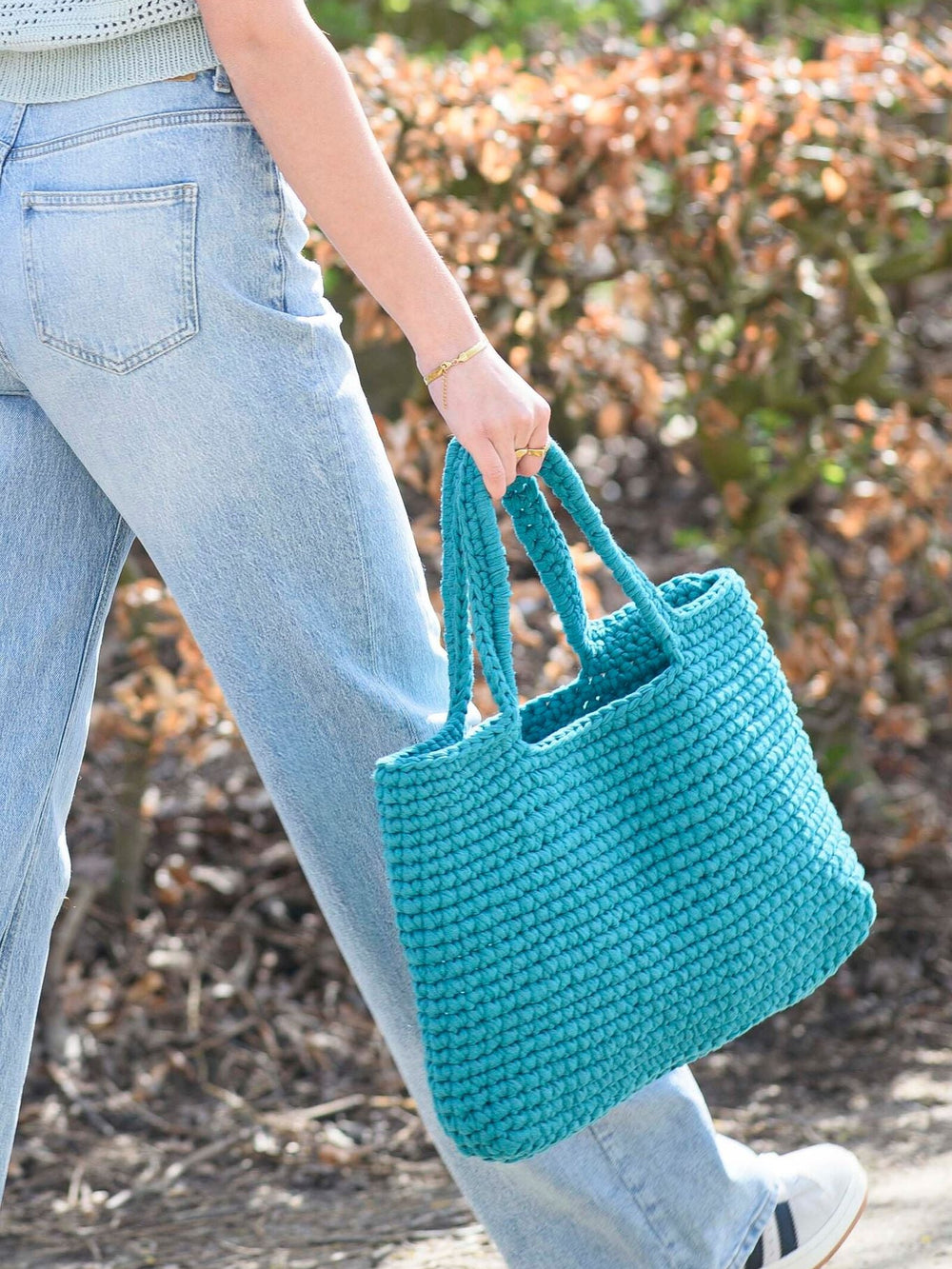 Stor og rummelig skuldertaske, som nemt kan laves med forskellige farveudtryk, ligesom du kan hækle den i to forskellige størrelser. Carolines taske hækles med 2 tråde Mayflower Ribbon, og du kan derfor lege med farverne.