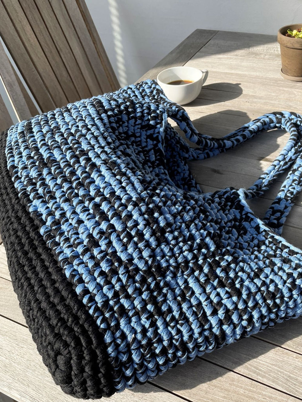 Hækler du med tråde i den samme farve, får du et ensfarvet look, og vælger du tråde i forskellige farver, får du et meleret farveudtryk. I den viste model er der fx brugt 2 tråde sort til bunden, mens siderne og hanken er hæklet med 1 tråd sort og 1 tråd blå.