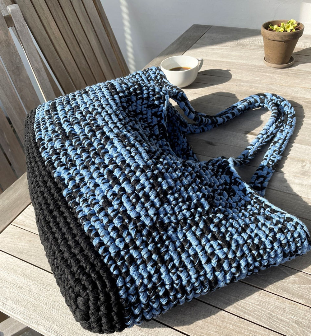 Stor og rummelig skuldertaske, som nemt kan laves med forskellige farveudtryk, ligesom du kan hækle den i to forskellige størrelser. Carolines taske hækles med 2 tråde Mayflower Ribbon, og du kan derfor lege med farverne. Hækler du med tråde i den samme farve, får du et ensfarvet look, og vælger du tråde i forskellige farver, får du et meleret farveudtryk. I den viste model er der fx brugt 2 tråde sort til bunden, mens siderne og hanken er hæklet med 1 tråd sort og 1 tråd blå.