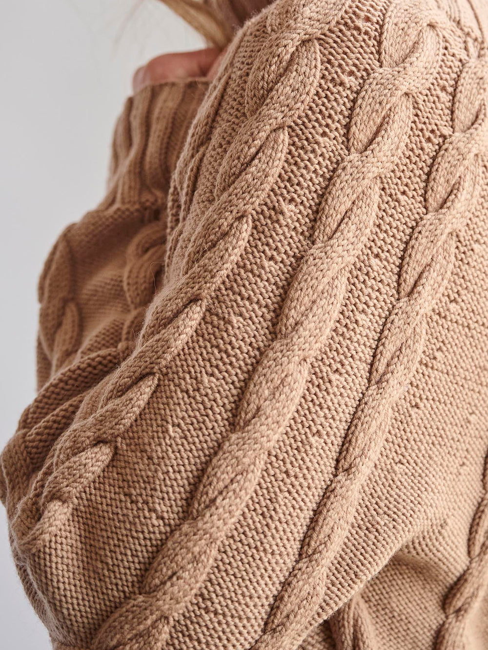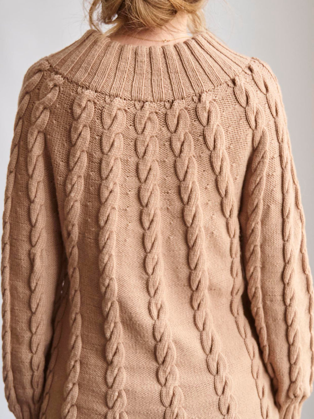 Modellen strikkes topdown med et minimum af montering. Mellem snoninger strikkes glat vrang, og halskanten og ærmekanterne strikkes i rib.