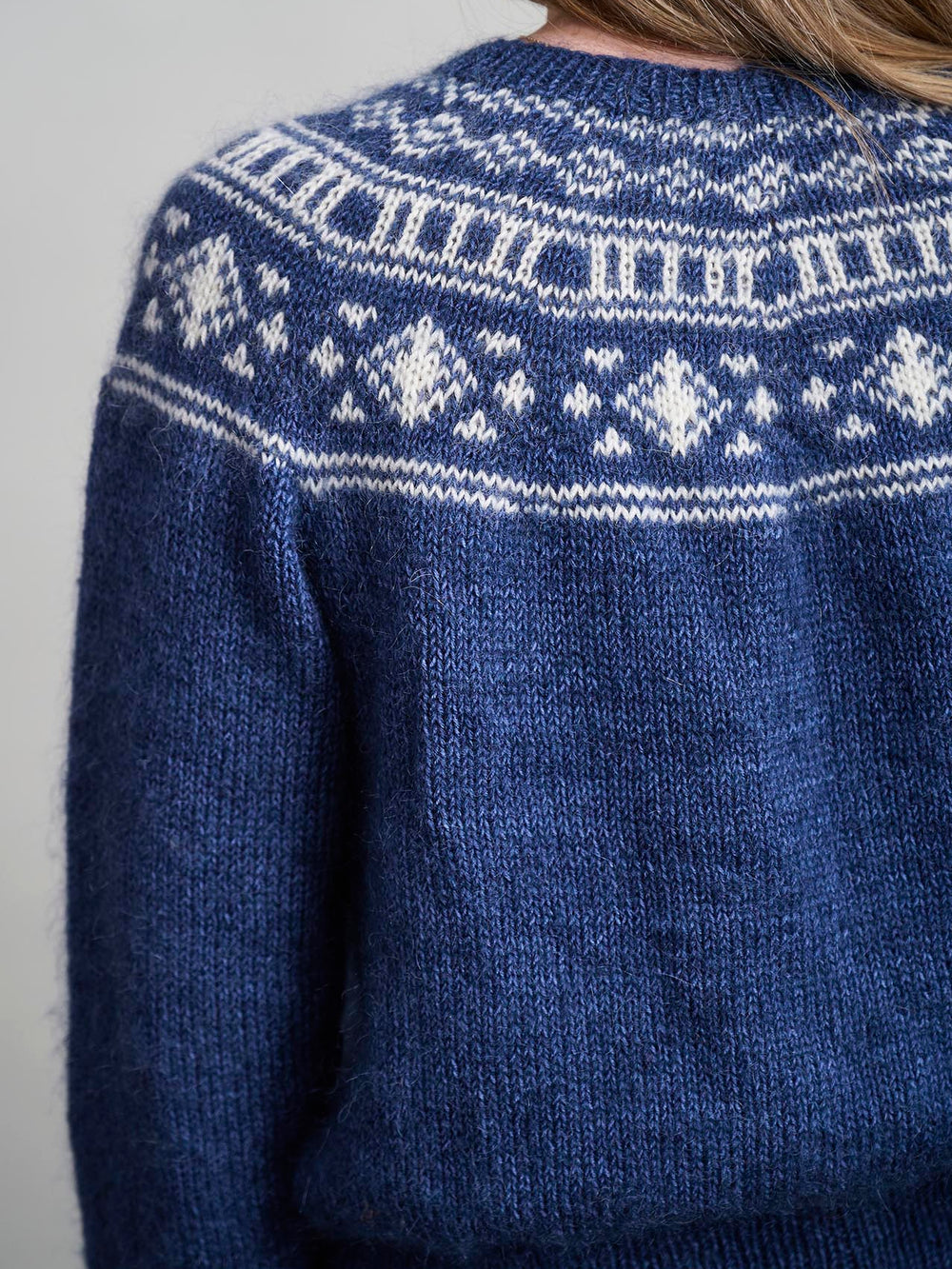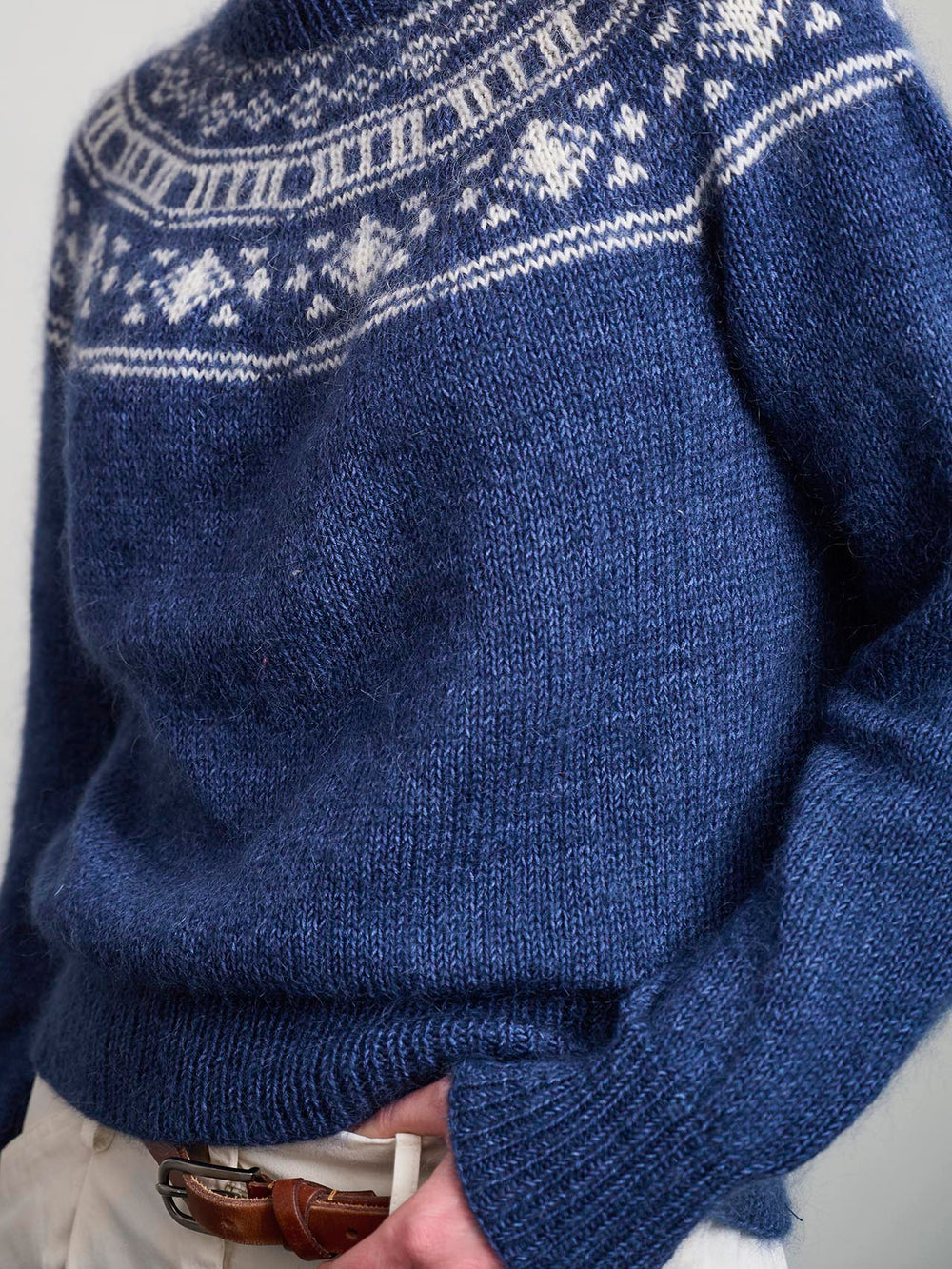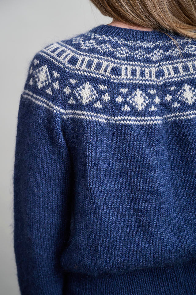 Cesi sweater strikkes oppefra og ned med flerfarvet strik og flot mønster i bærestykket. Sweateren strikkes med to tråde igennem hele arbejdet: 1 tråd Mayflower Amadora + 1 tråd Mayflower Super Kid Silk. Kombinationen af det håndfarvede uldgarn og det bløde mohair giver et lækkert og behageligt resultatet. Kombinér dine yndlingsfarver, og lav din egen Cesi sweater.