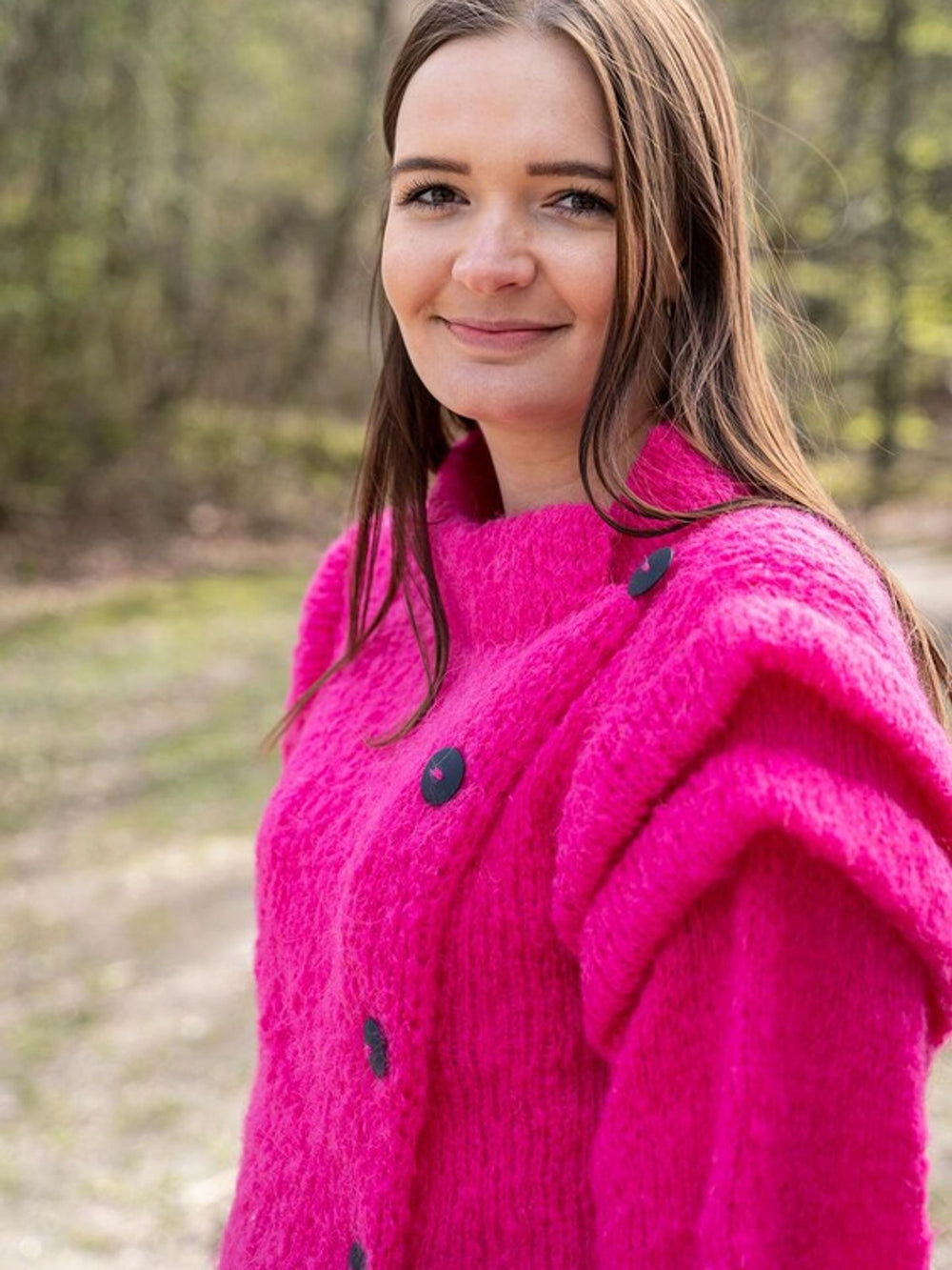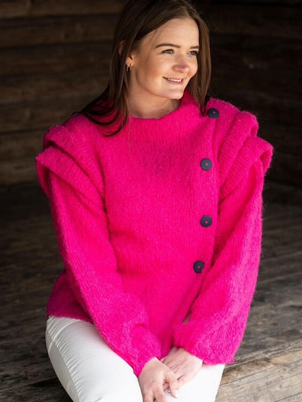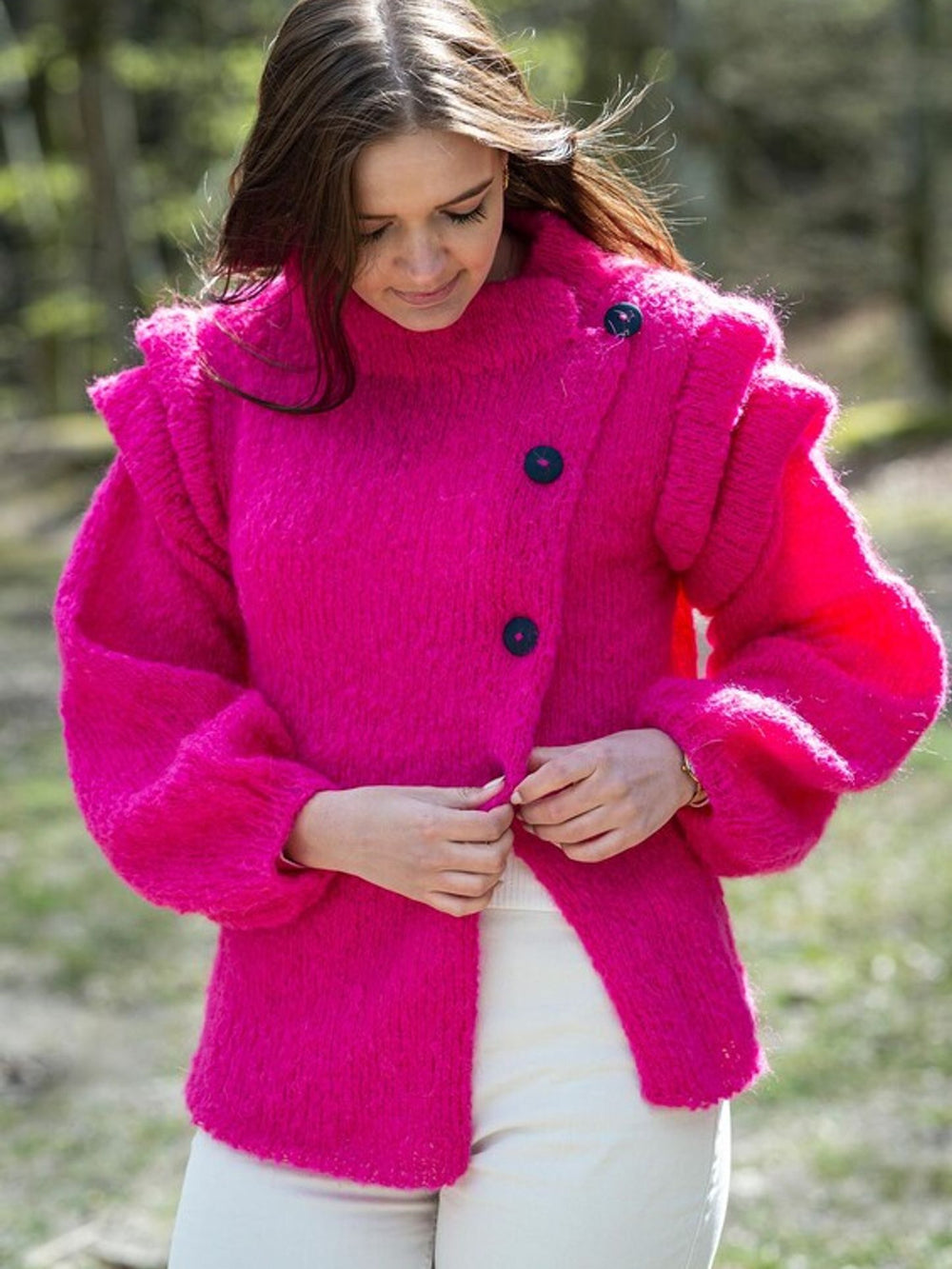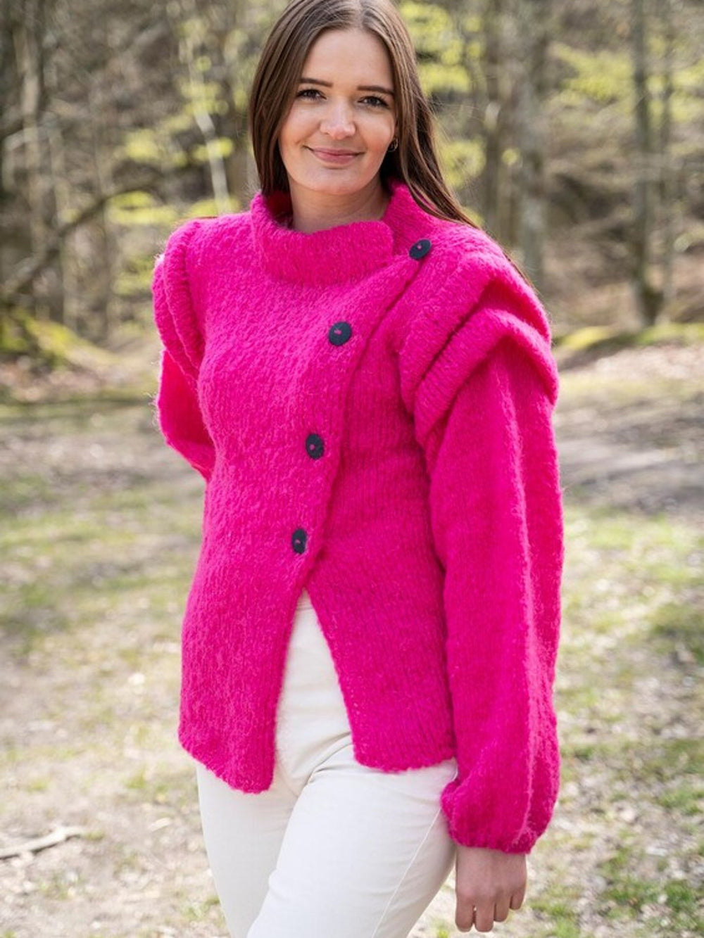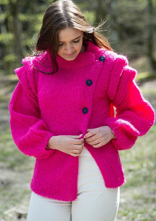 Christel jakken er virkelig unik med sit skrå snit og flotte læg på ærmerne. Det perfekte strikkeprojekt til den eventyrlystne strikker, og derfor har vi også valgt at strikke den i en vild pink farve med knald på.