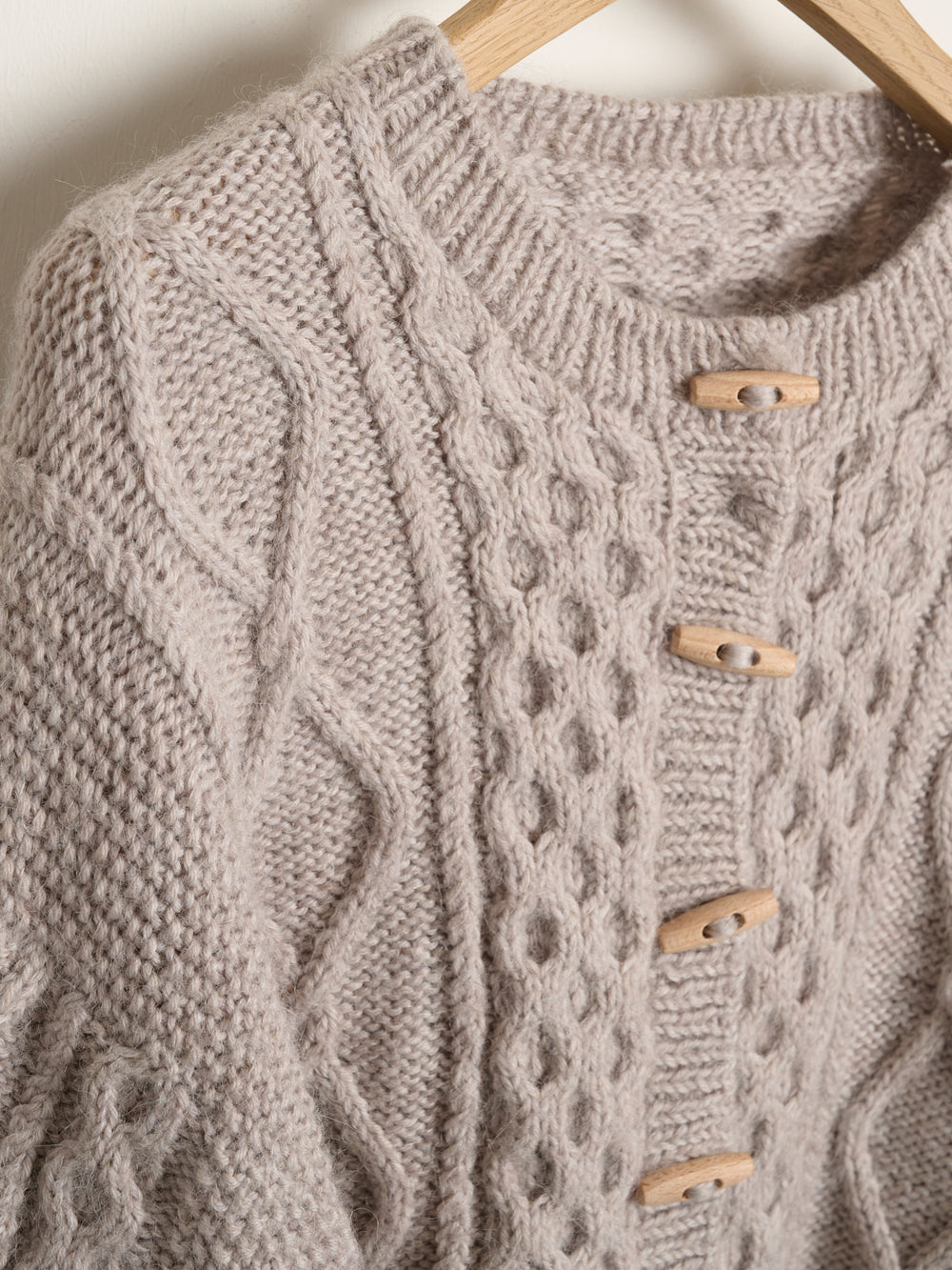 Dagmar jacket er strikket i Mayflower Easy Care Big. Et tykt garn i 100% uld, som er blødt og tåler vaskemaskine og tørretumbler. Cardiganen er derfor nem at rengøre.
