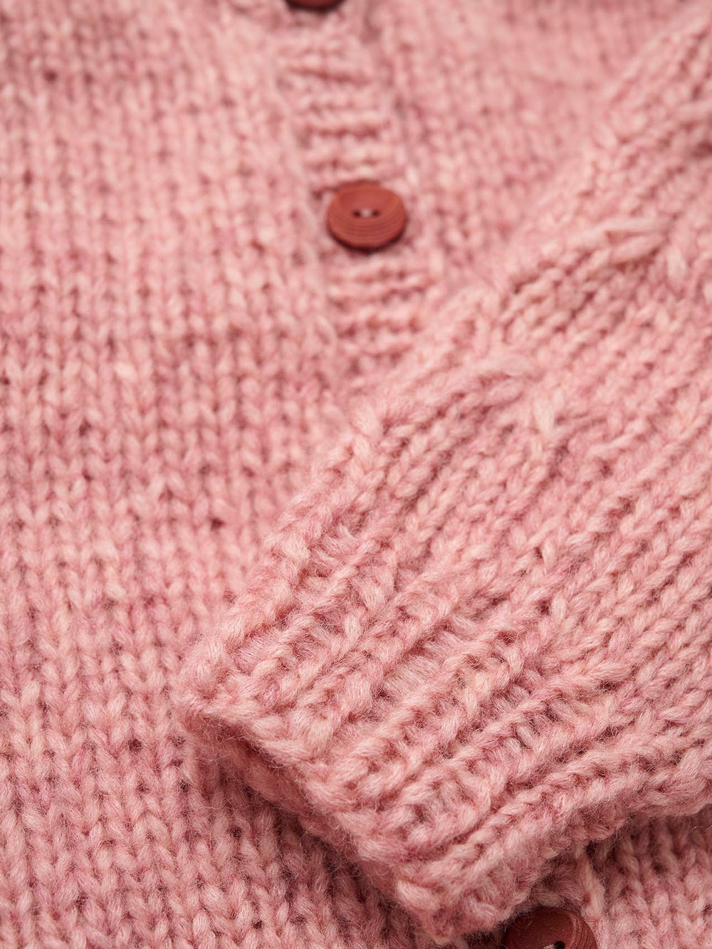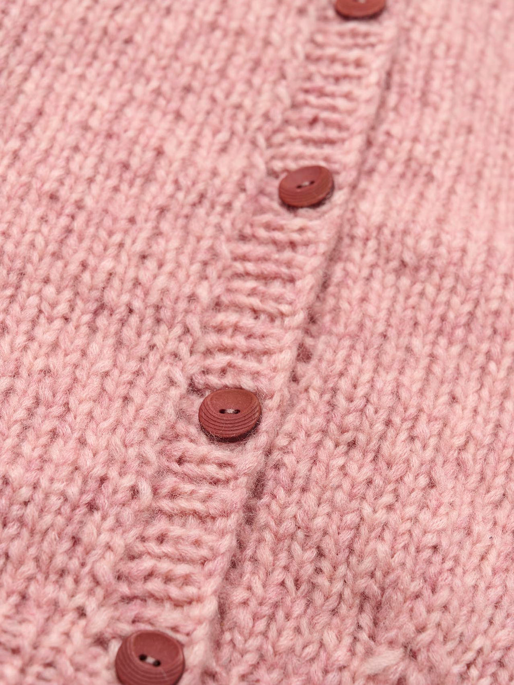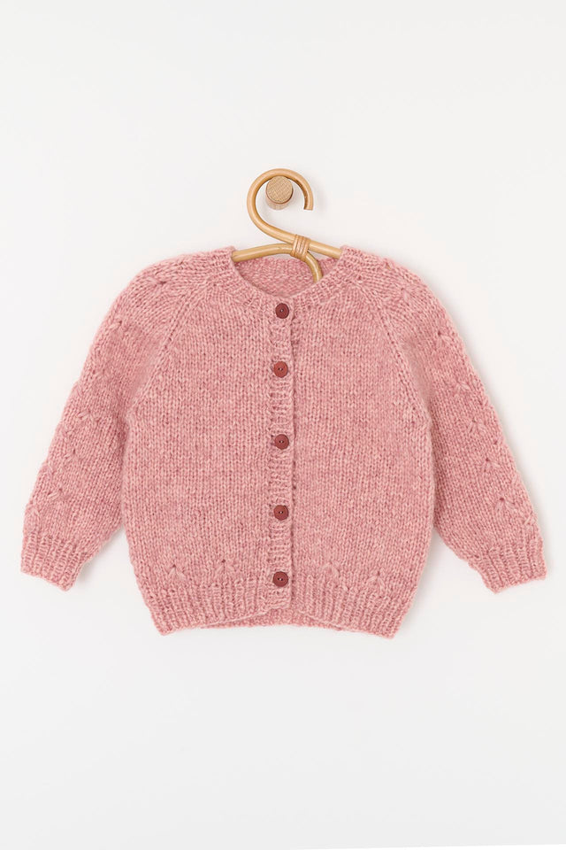 Dea cardigan er strikket i Mayflower Anyday Breezy, som er en prisvenlig, fluffy uldblanding med god volumen. Garnet er blødt og let med en cool melering og fås i mange skønne og mættede nuancer. Opskriften findes også til både kvinder (2123), ligesom designet også findes i en anden juniorversion (146-5), hvor cardiganen strikkes med én tråd Baby Alpaca og én tråd Super Kid Silk.