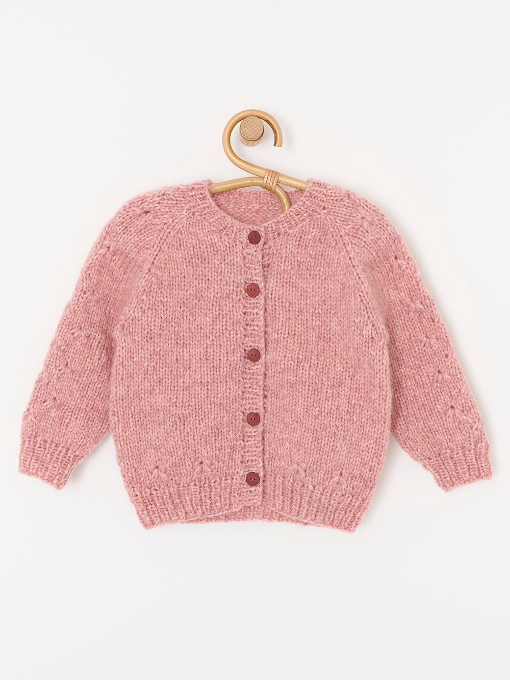 Lækker og vamset cardigan til junior med et fint og enkelt mønster på ærmerne, nederst på for- og bagstykke samt øverst på ryggen. Cardiganen strikkes oppefra og ned i glatstrik med simple raglanudtagninger og knaphuller i forstykket. For at resultatet ligner billedet i opskriften, og mønsteret bliver korrekt, kan du lave en strikkeprøve, som vaskes og tørres, før du måler din strikkefasthed.