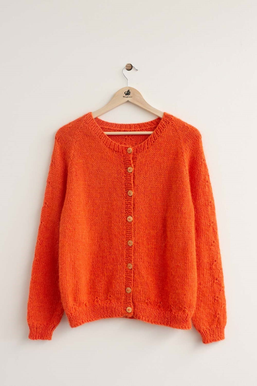 Cardiganen strikkes oppefra og ned i glatstrik og har raglanudtagninger i bærestykket, og den er derfor meget klassisk i sin opbygning.