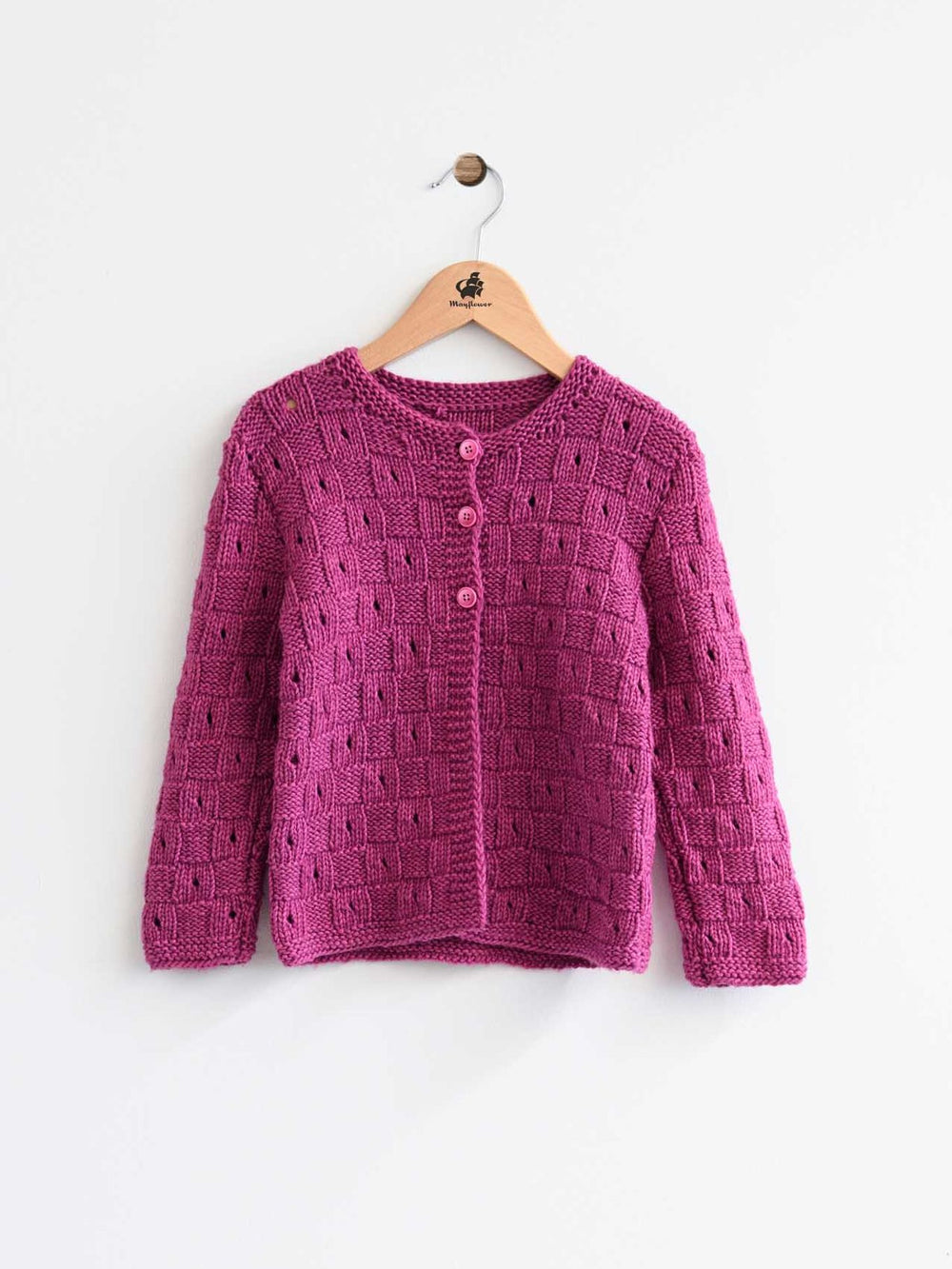 Cardiganen er strikket i Mayflower Venezia, som består af uld og bomuld og fås i en masse flotte farver. En garnblanding, som er fin til børn, da den er lun uden at blive for varm. Samtidig er Venezia også meget blød og derfor god til den sarte børnehud.