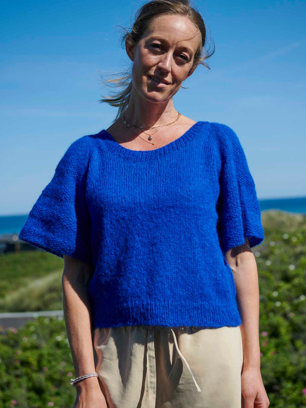 Diana tee strikkes topdown med raglanudtagninger og er en virkelig blød, let og luftig kortærmet bluse. Den strikkes i glatstrik, men med en kombination af glatstrik og perlestrik på de korte ærmer, hvilket danner en enkel og fin kontrast til den øvrige glatstrik. Diana tee er oplagt til helårsbrug, da den er god på varme dage, ligesom den også er oplagt at bruge med en langærmet bluse under.