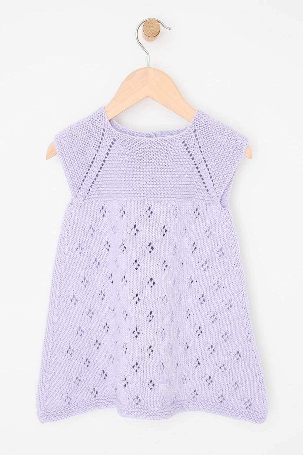 Luftig og fin sommerkjole i A-snit til de mindste med et dekorativt hulmønster. Kjolen har korte ærmer, raglan og en fin detalje med knaplukning øverst på ryggen. Den strikkes oppefra og ned og har et minimum af montering.