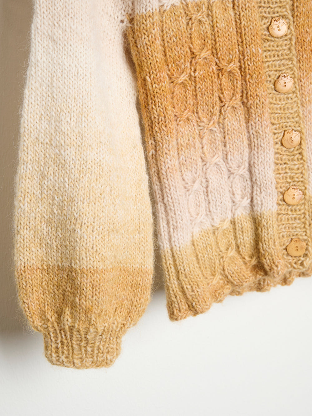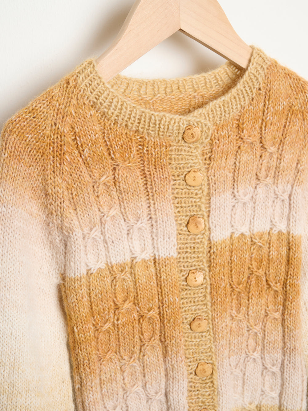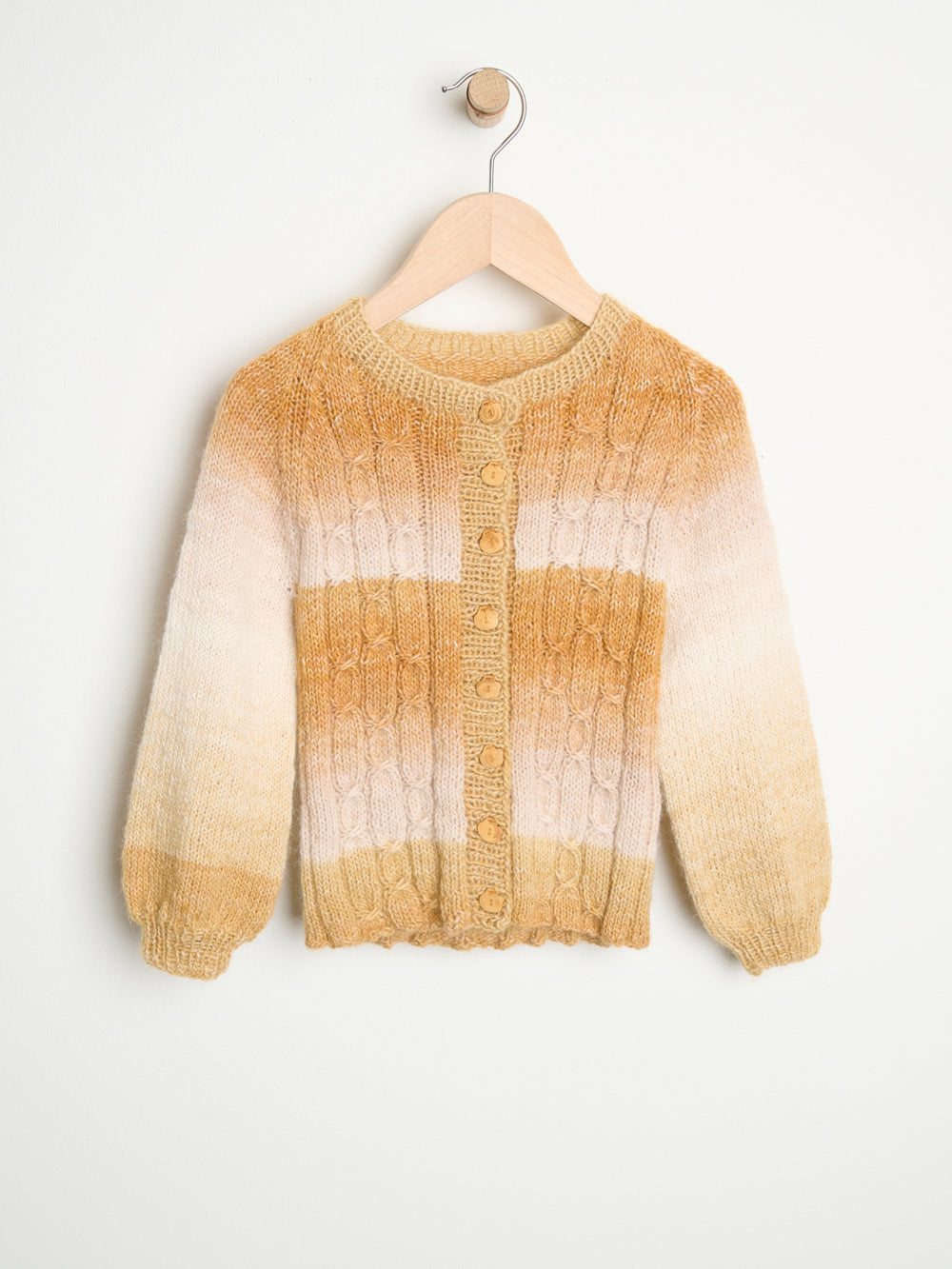 Guldlok er en flot cardigan med et fint snoningsmønster på forstykkerne, samt bred ribmønster på ryggen.