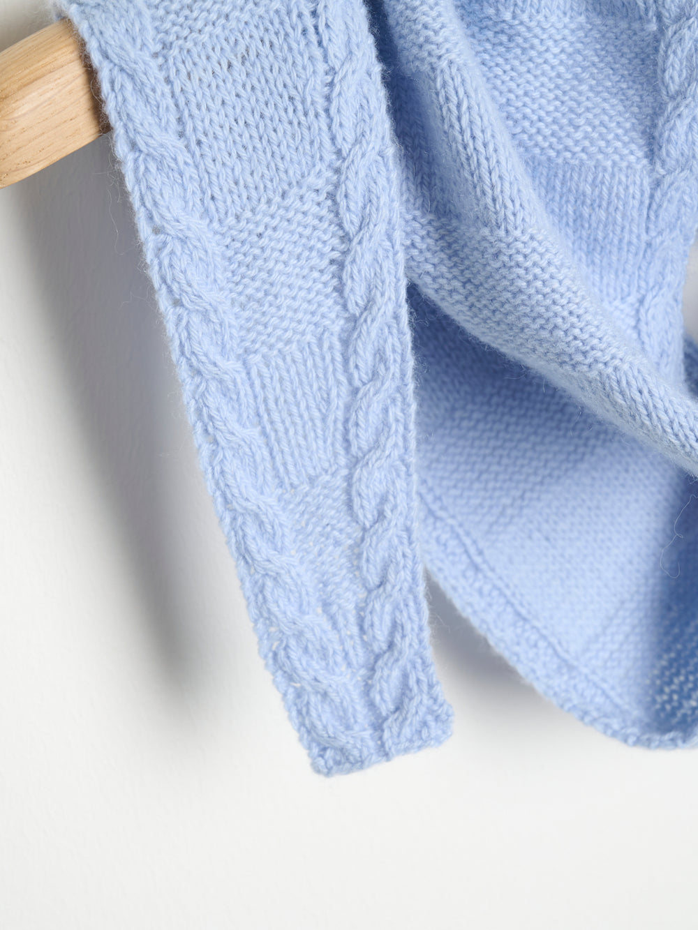 Caras har en flot snoningskant i begge sider og skiftevis glatstrik og omvendt glatstrik i midterpartiet.