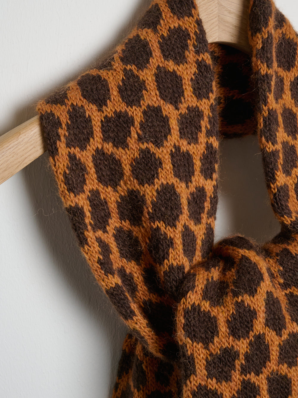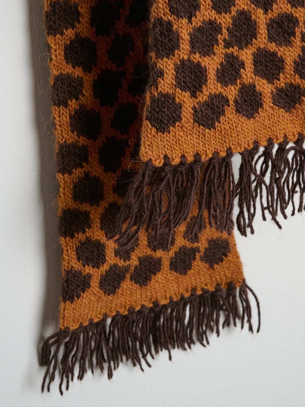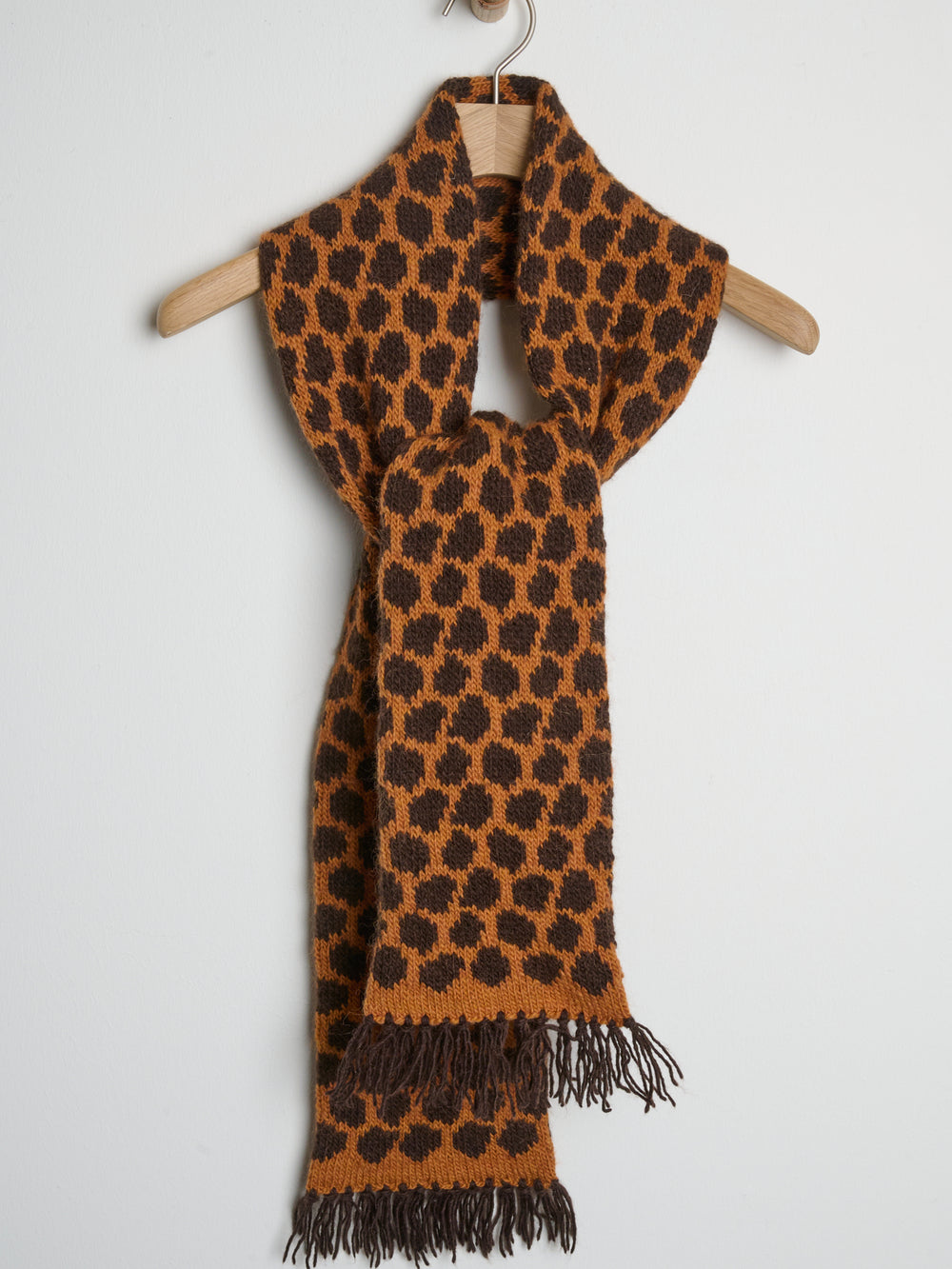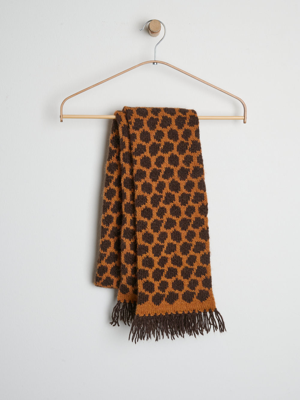 Det er strikket i 2 farver med flot ”Giraf” mønster og korte frynser,