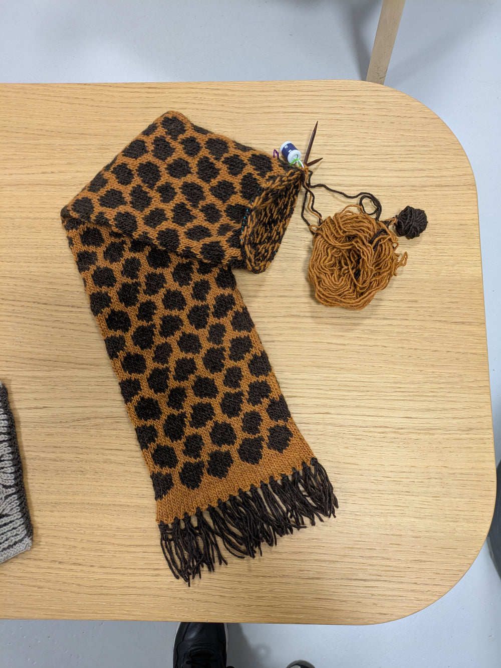 Det er strikket i 2 farver med flot ”Giraf” mønster og korte frynser,